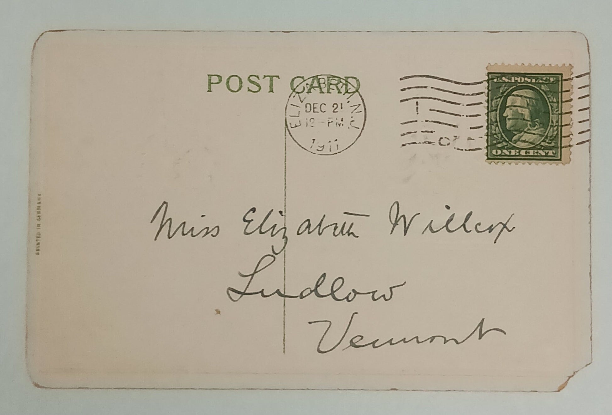 mailed: December 21st, 1911, from Elizabeth, NJ to Ludlow, using a green, $0.01 Benjamin Franklin stamp.