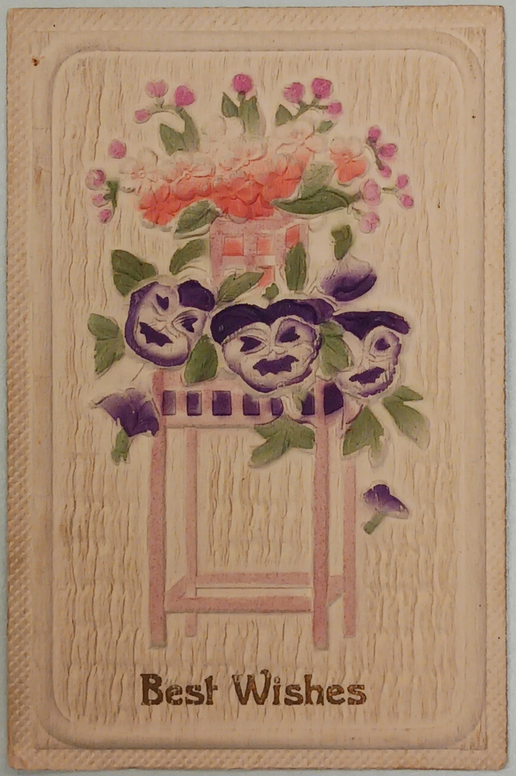 Best Wishes Card - Embossed purple pansies, pink daises, and embroidery