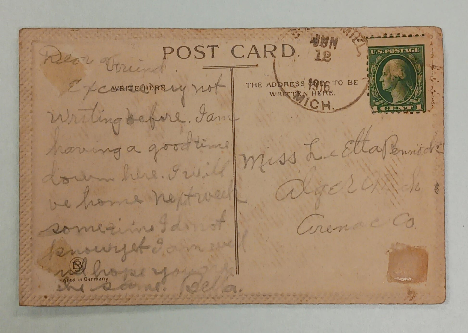 Mailed: Postmark 1912 green one cent George Washington stamp.