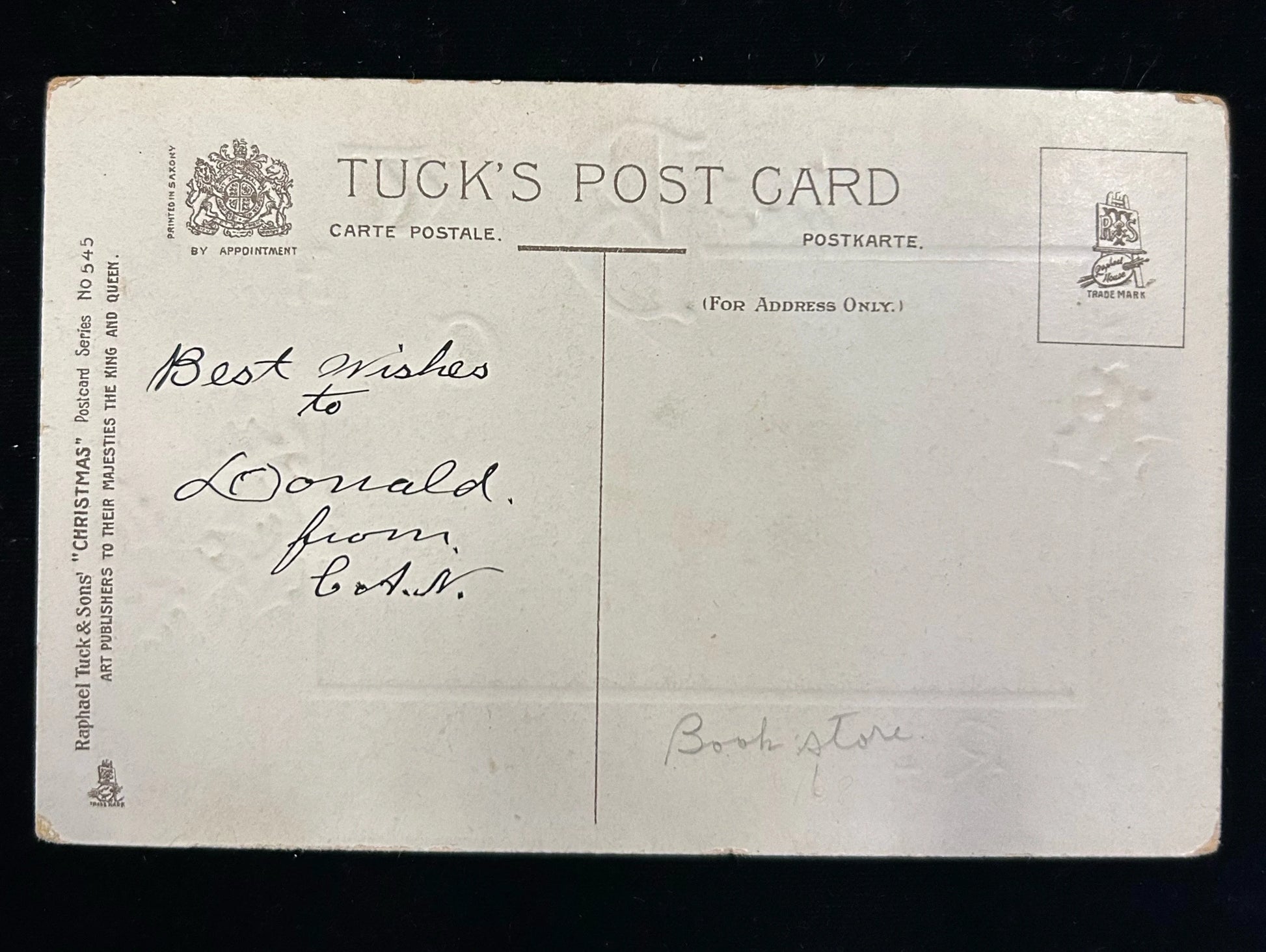 Back information: Raphael Tuck & Sons' "Christmas" Postcard series No 545 Art Publishers to their majesties the King and Queen. Tuck's Post Card
