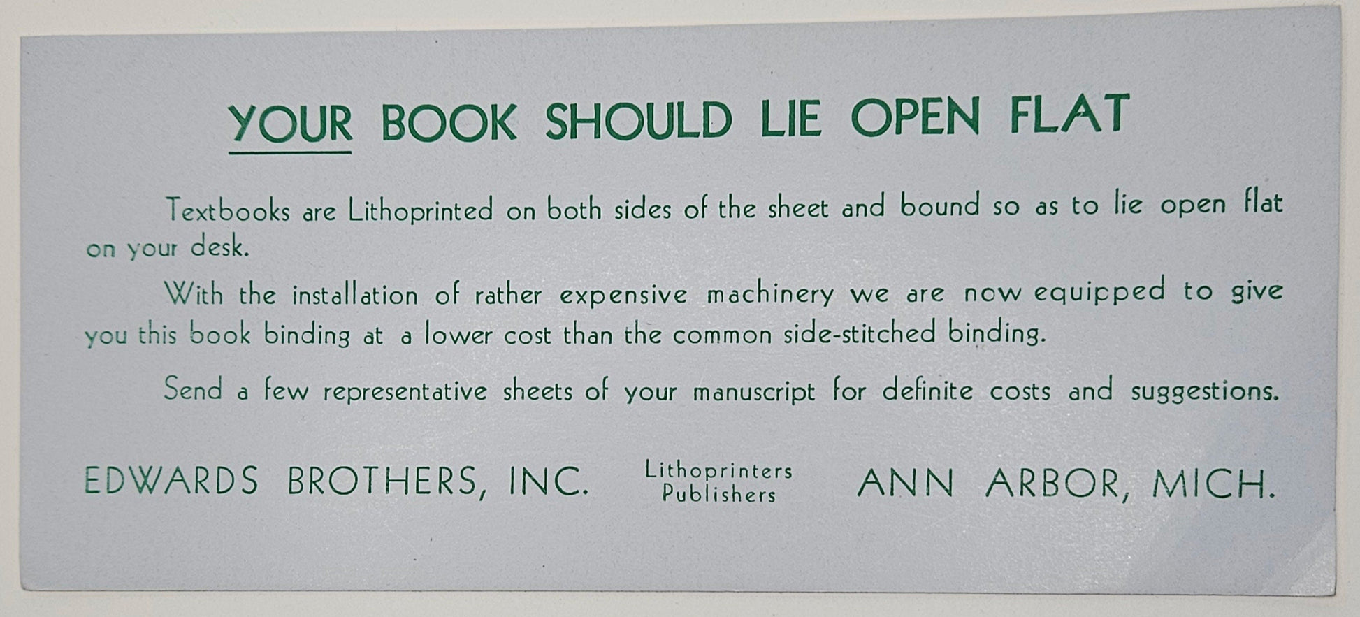 This is an advertising piece from a book printing company in Ann Arbor, Michigan. It is selling a new and improved method of binding text books.