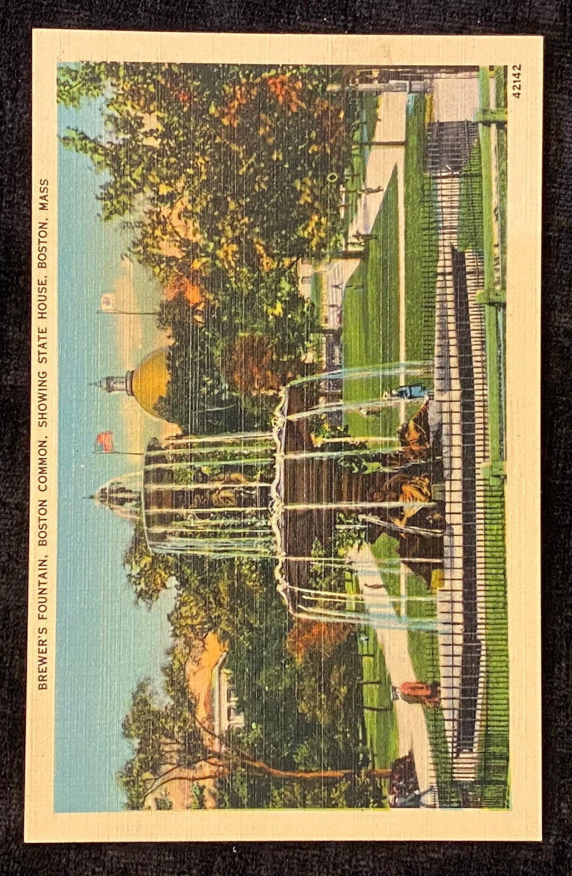 Brewer's Fountain - Boston Common - Showing State House - Boston, Massachusetts - 1940s Linen Postcard