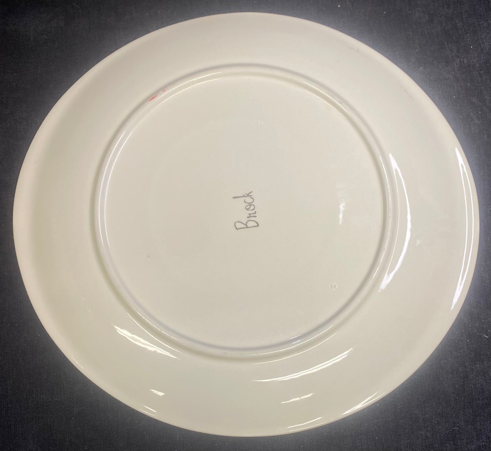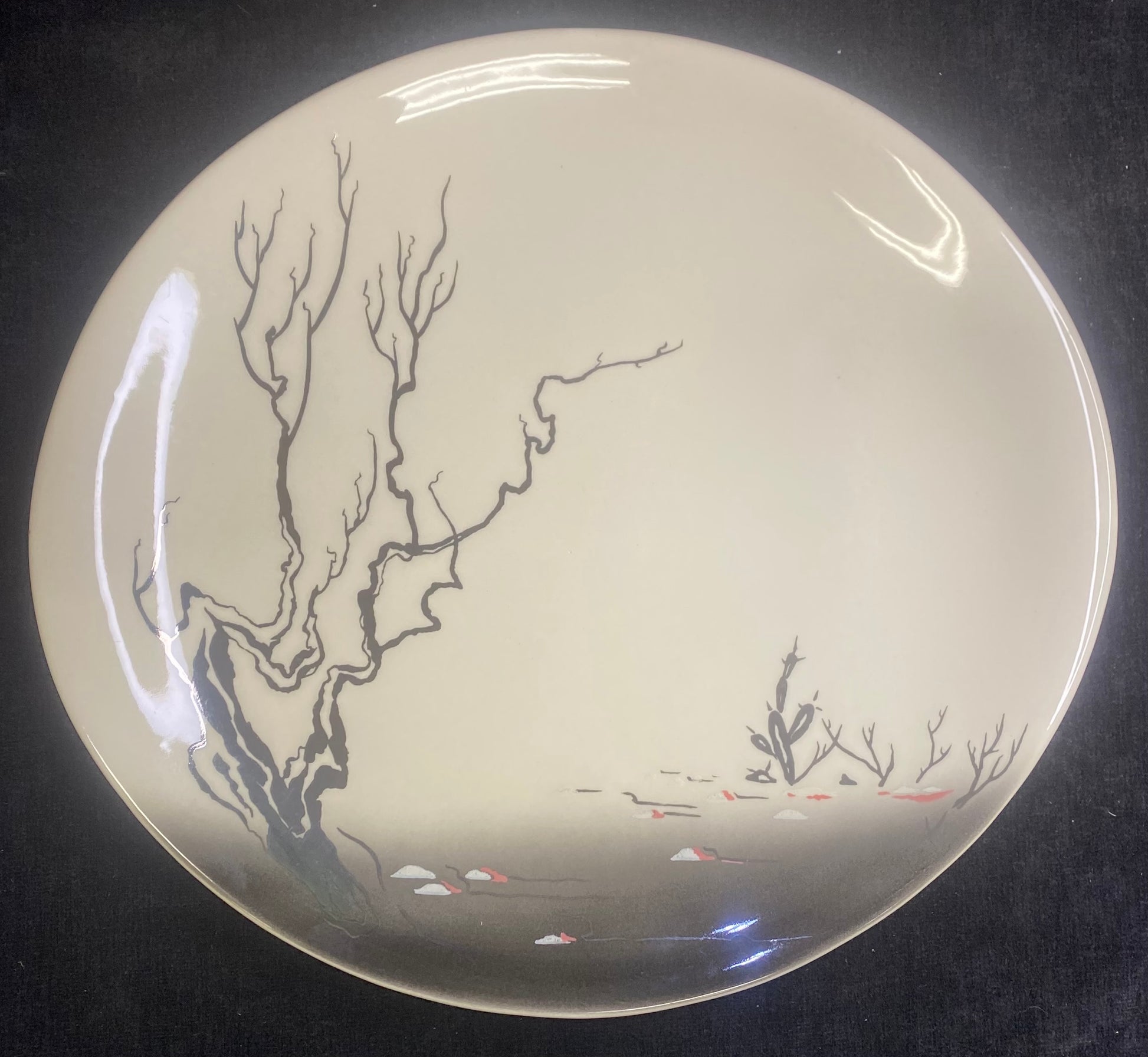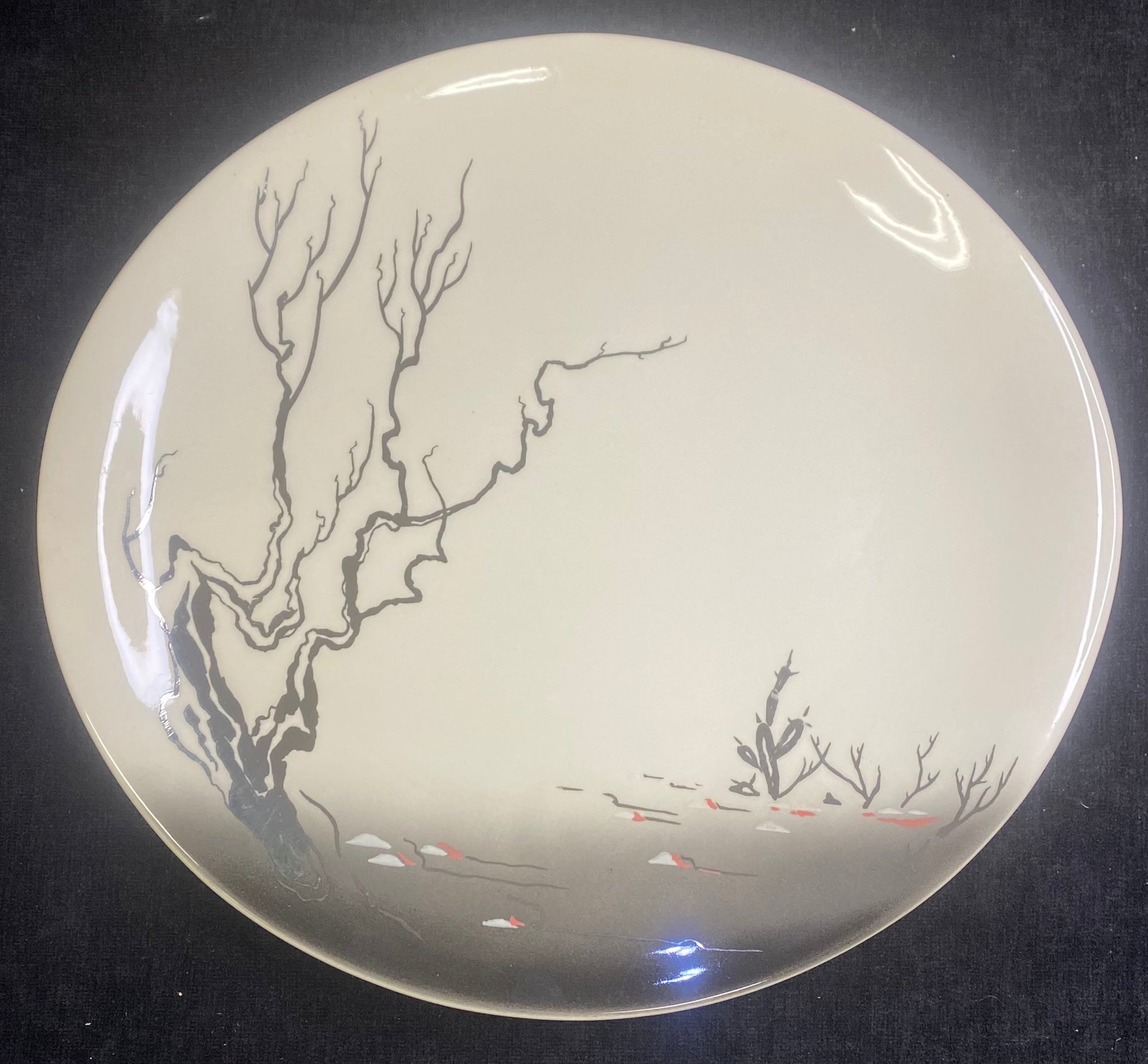 This set of two Brock California plates in Manzanita pattern showcases a platinum tree and cactus with orange sand. These specific plates are in excellent condition with no chips and a perfectly preserved design. Plates are sold together as a set.