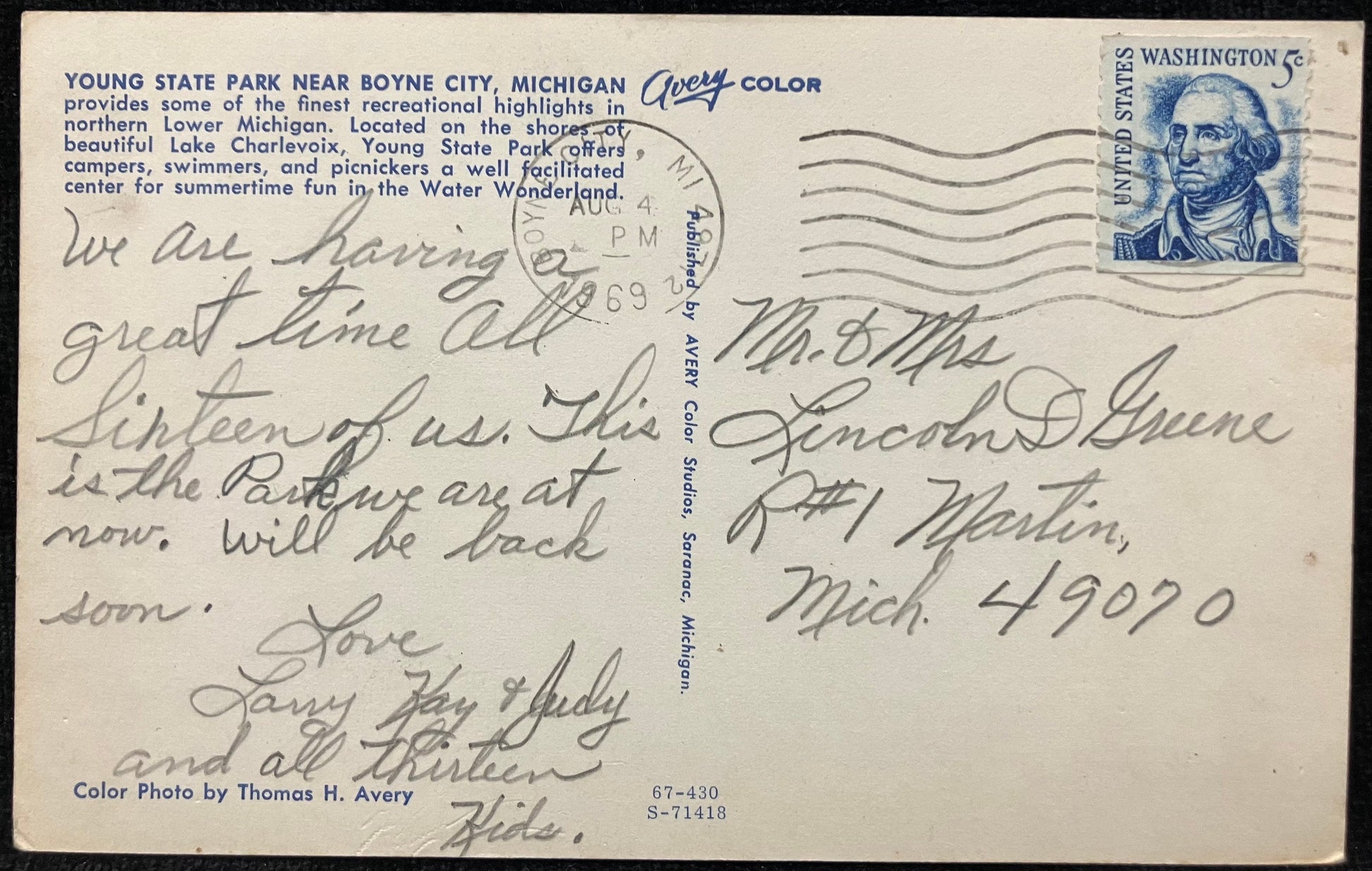 Mailed: Postmark: 1969 MI. blue five cent George Washington stamp