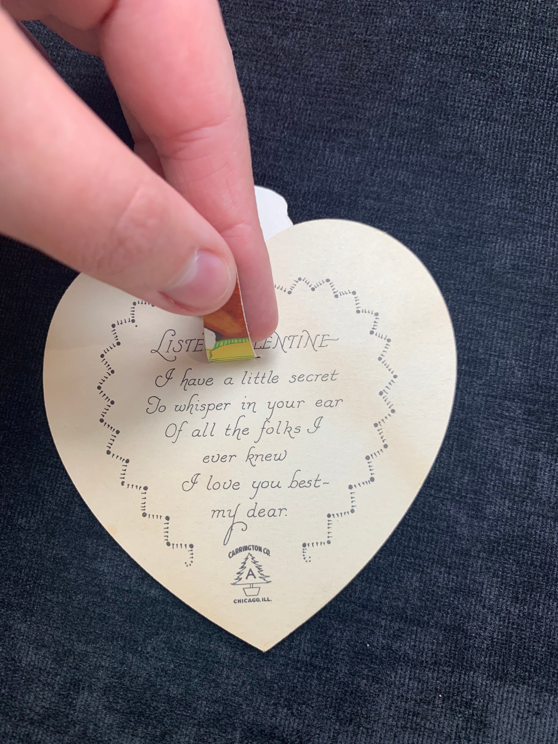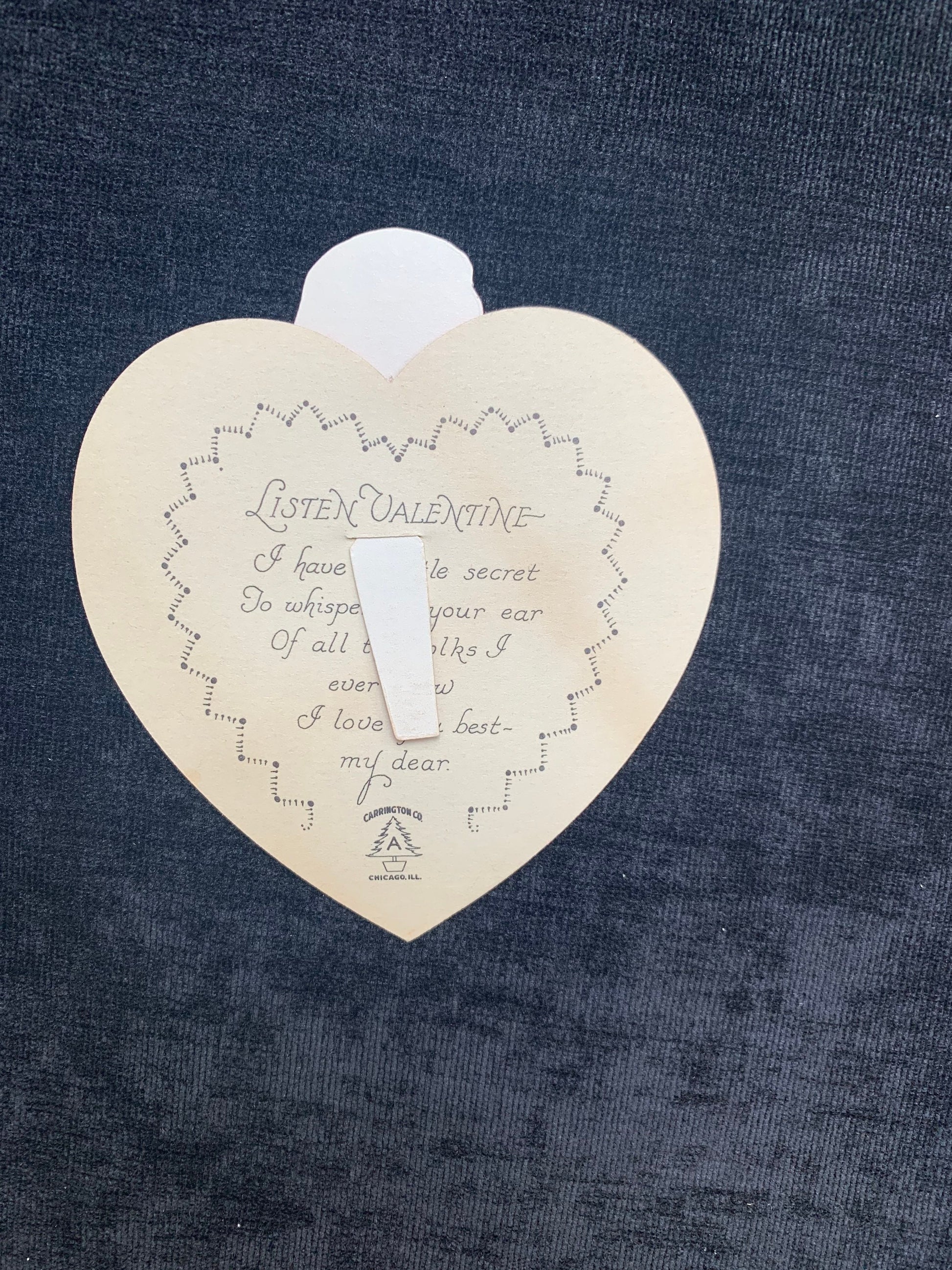 This card was made by the Carrington Card Company, which was founded in 1917 in Chicago. The company was active until the late 1950's. This Valentine is simplistic in the shape of a red heart. The front side shows a cute boy in a yellow shirt with a button nose. He sticks out of the card and is able to move by a tab on the back. The front says, "Be my Valentine, You're not hard to take." The back has another message printed saying, "Listen Valentine: I Have a little secret to whisper in your ear, of all the folks I ever knew, I love you the best, my dear." The Carrington logo is also on the back. This card is made from a heavy paper and is in excellent condition. There are no rips or bends in the card.