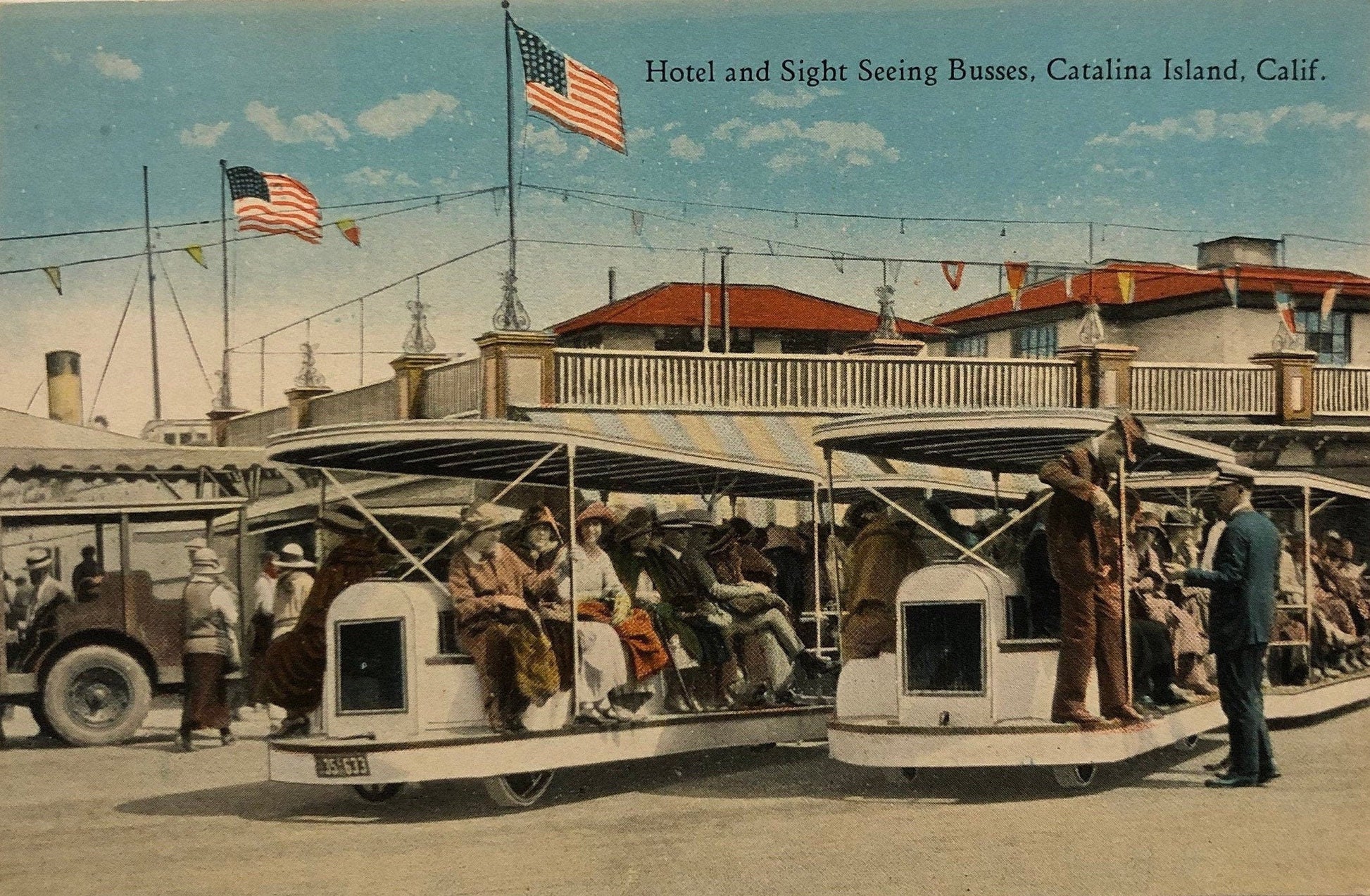 This vintage postcard of Catalina Islands, California was published by Western Publishing & Novelty Co. in the 1930's. The front of the postcard features a lovely picture of a hotel and its sight seeing buses filled with tourists on Catalina Island. In the background of the photo you can see a hotel with a red roof, in the 30's there was one hotel with a red roof, which was known as St. Catherine Hotel. This hotel was internationally known in its hay day but was unfortunately decommissioned then torn down in the 60's. The back of the postcard is marked Theo Sohmer, Los Angeles. It is unused.