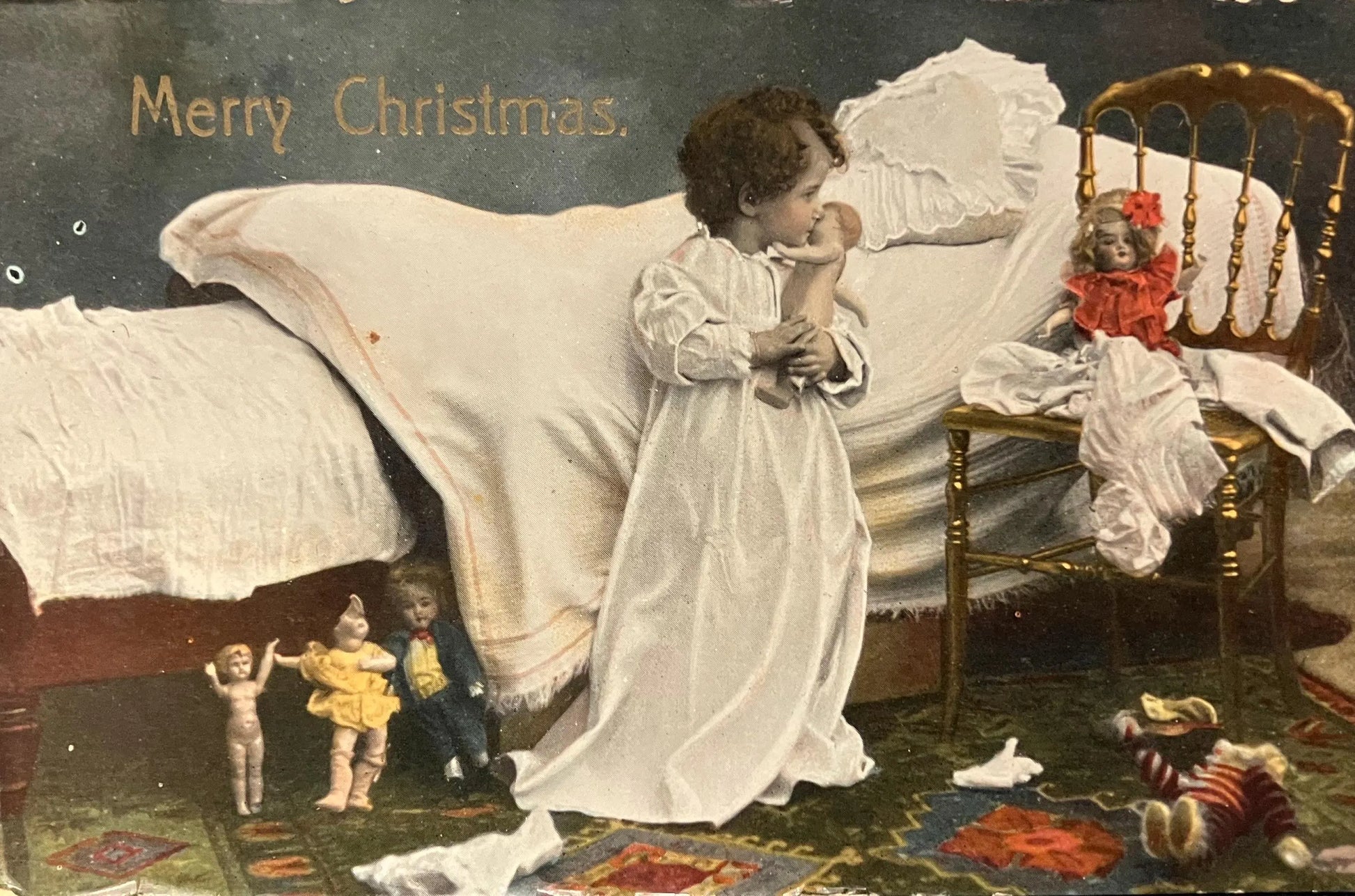Child by Bed Playing With Christmas Toys - Merry Christmas - Made in Saxony - Vintage Postcard