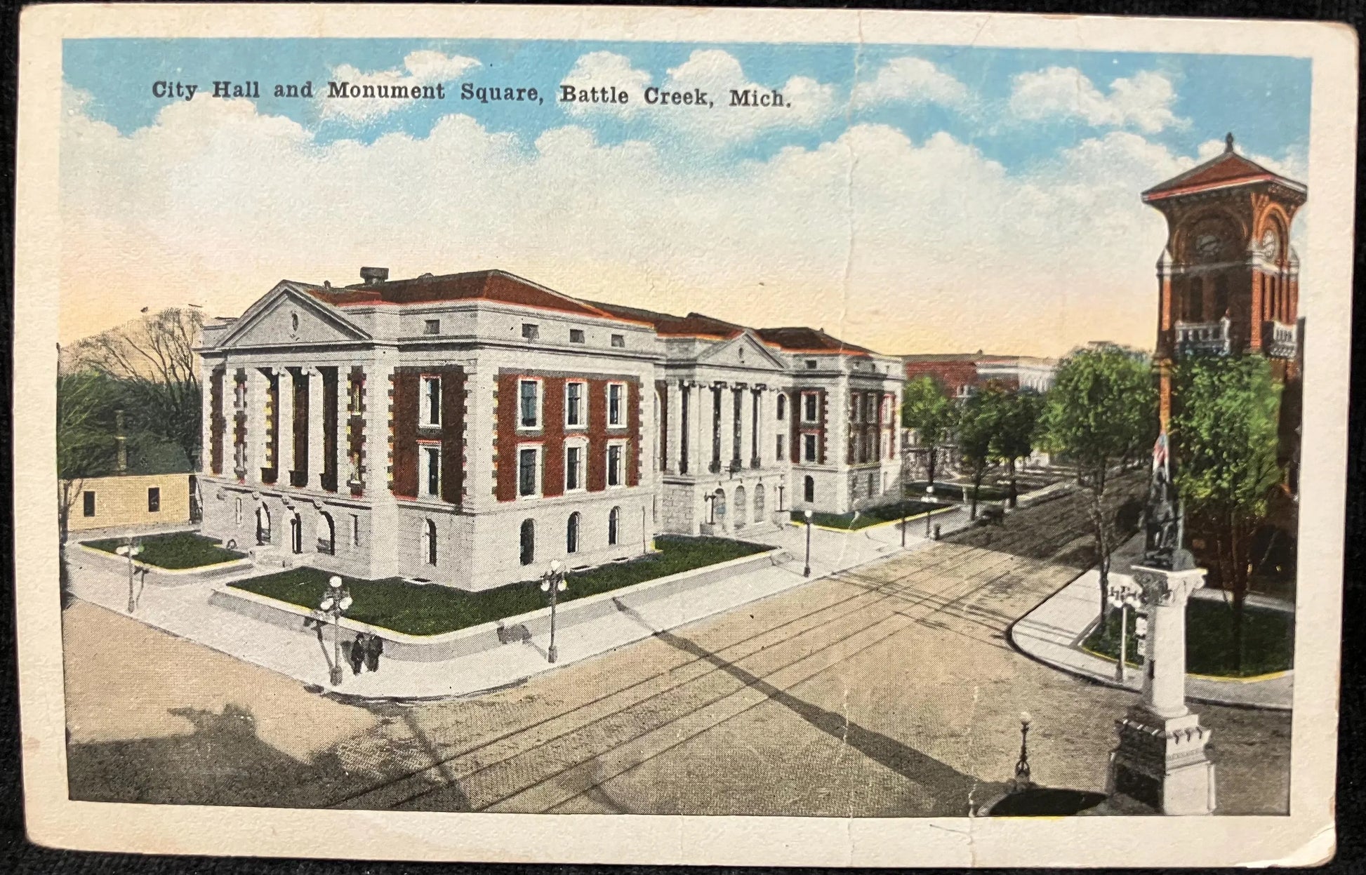 City Hall and Monument Square, Battle Creek, Michigan - Vintage Postcard