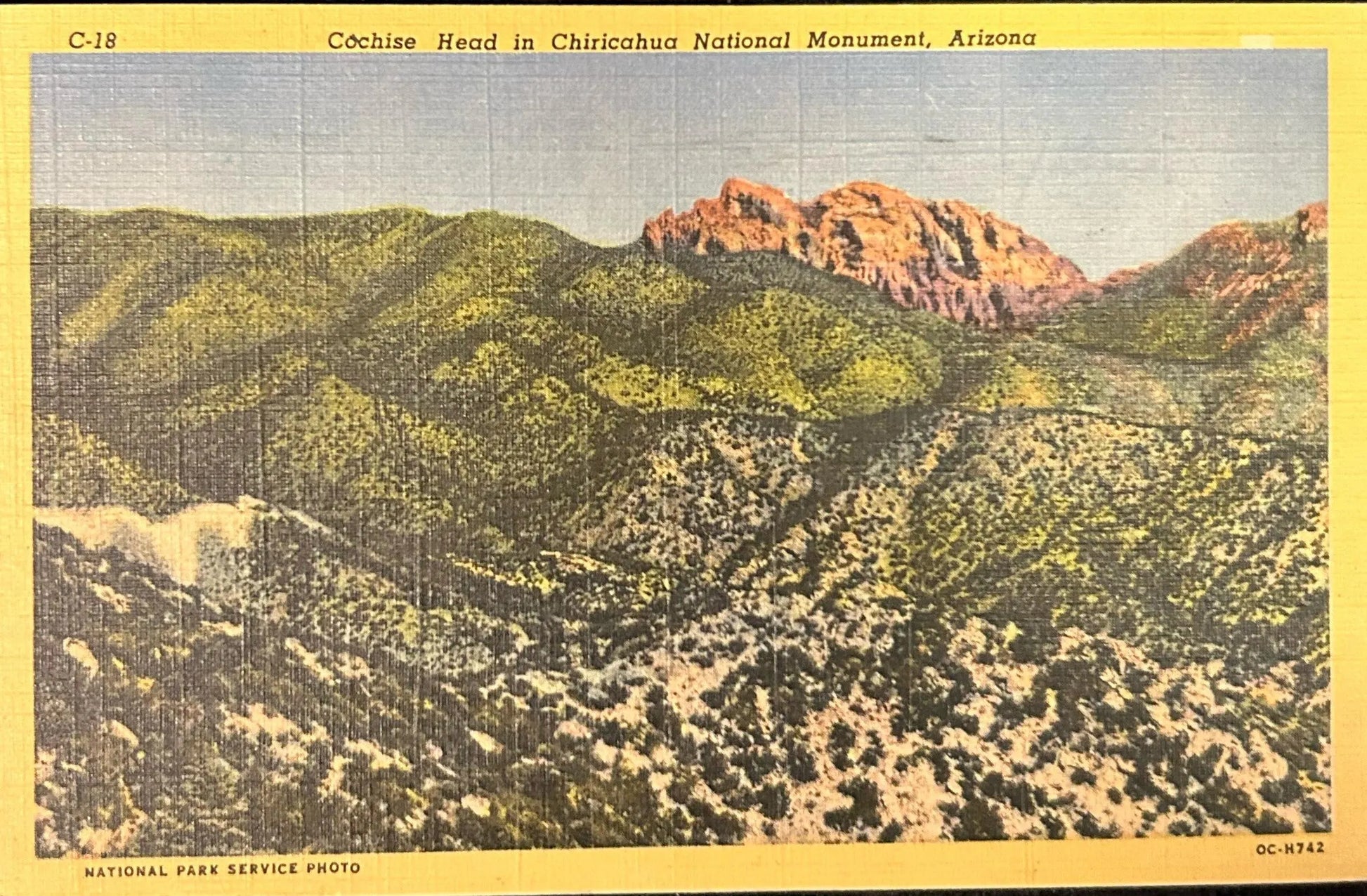 Back: Cochise Head, the bare rock top of a ridge in the northern part of the Chiricahua Mountains, which, silhouetted against the sky resembles the profile of Cochise, famous Apache Indian chief, may be seen from Highway 86 near San Simon and Bowie; also from Massai Point in Chiricahua National Monument, "wonderland of rocks", from which this picture was photographed.
