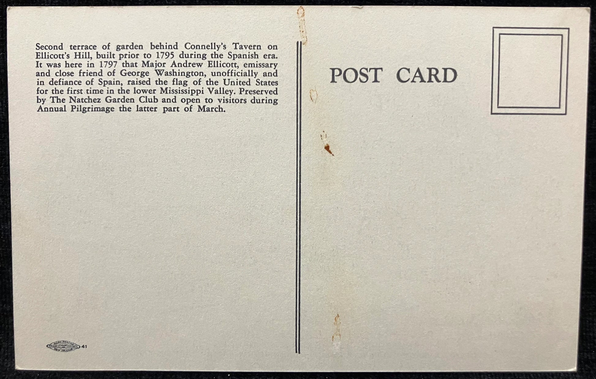 Back: Second terrace of garden behind Connelly’s Tavern on Ellicott’s Hill, built prior to 1795 during the Spanish era. It was here in 1797 that Major Andrew Ellicott, emissary and close friend of George Washington, unofficially and in defiance of Spain, raised the flag of the United States for the first time in the lower Mississippi Valley. Preserved by The Natchez Garden CLub and open to visitors during Annual Pilgrimage the latter part of March.