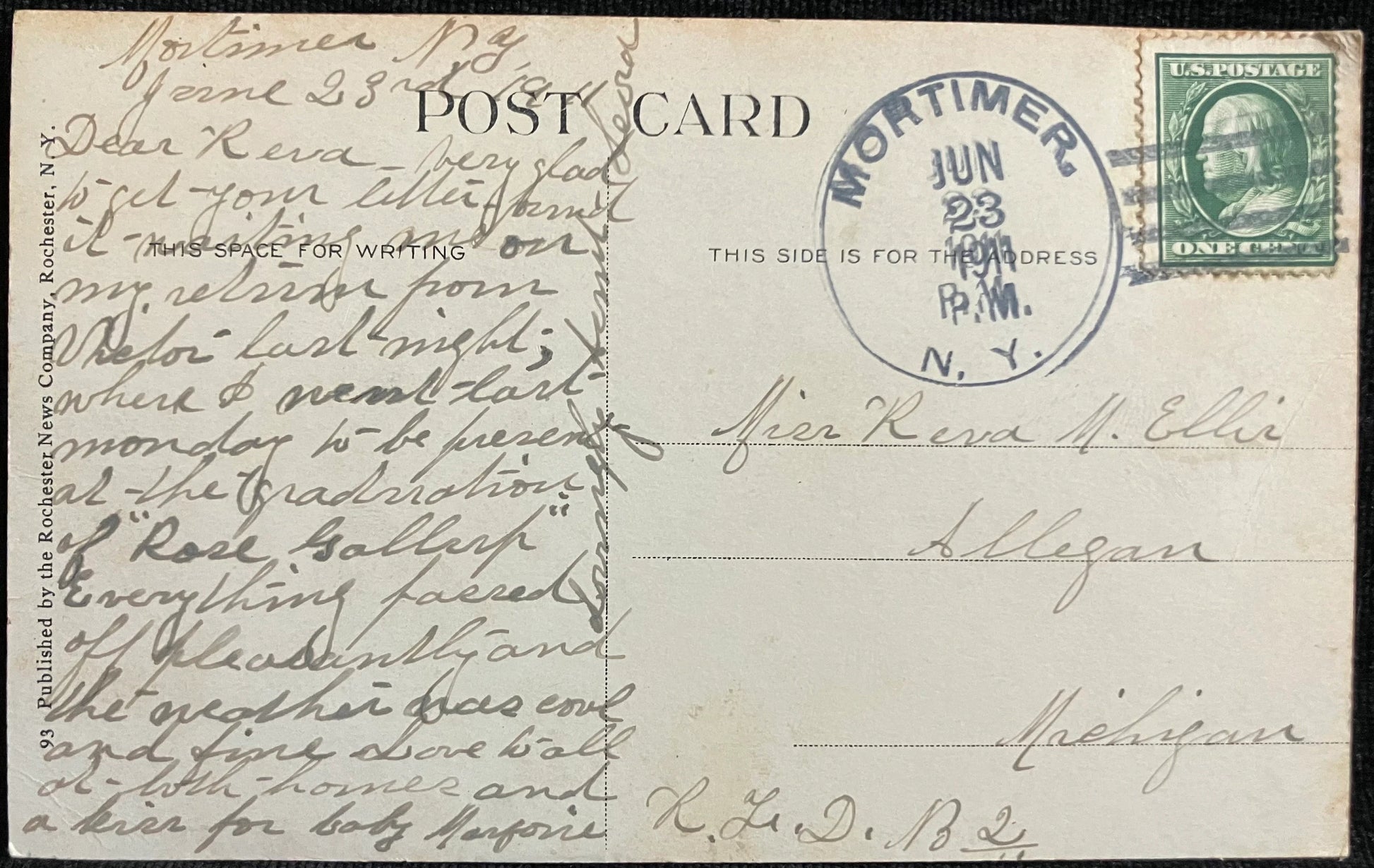 Mailed: Postmark on Jun 23, 1911 from Mortimer, N.Y. with a green one cent Benjamin Franklin stamp