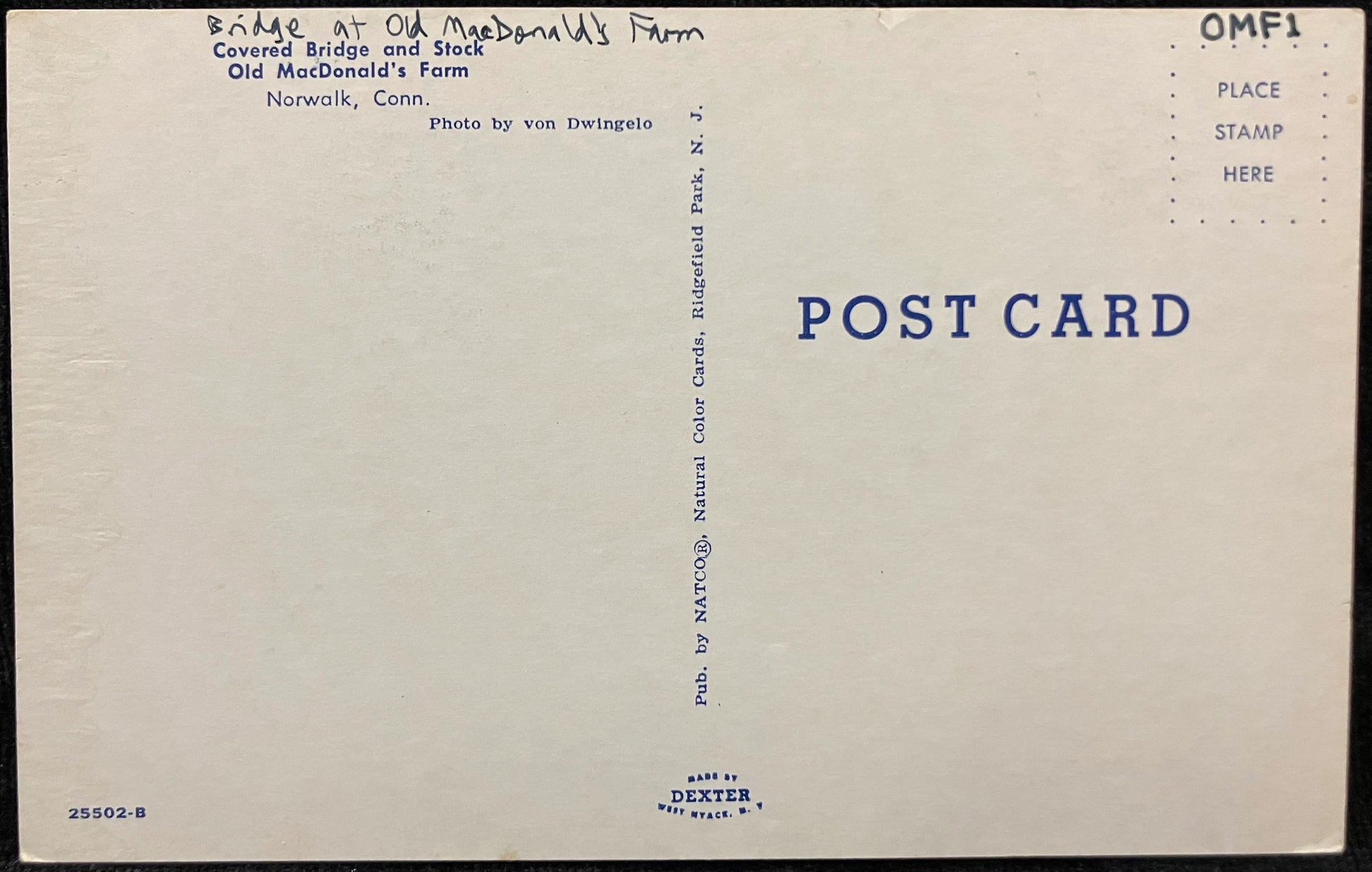 Covered Bridge and Stock - Old MacDonald’s Farm - Norwalk, Connecticut - Photo: Van Dwingelo - Vintage Bridge Postcard