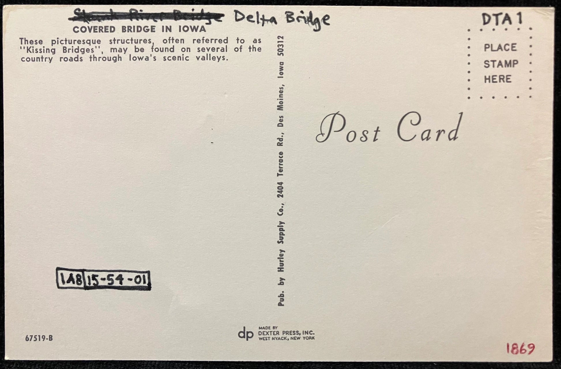 On back: These picturesque structures, often referred to as “Kissing Bridges”, may be found on several of the country roads through Iowa’s scenic valleys.