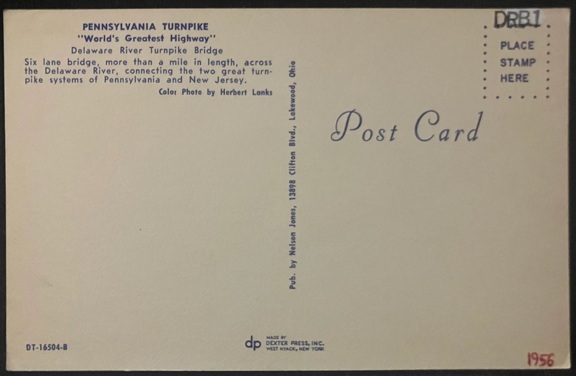 Back: Pennsylvania Turnpike " World's Greatest Highway" Delaware River Turnpike Bridge - Six lane bridge, more than a mile in length, across the Delaware River, connecting the two great turnpike systems of Pennsylvania and New Jersey.