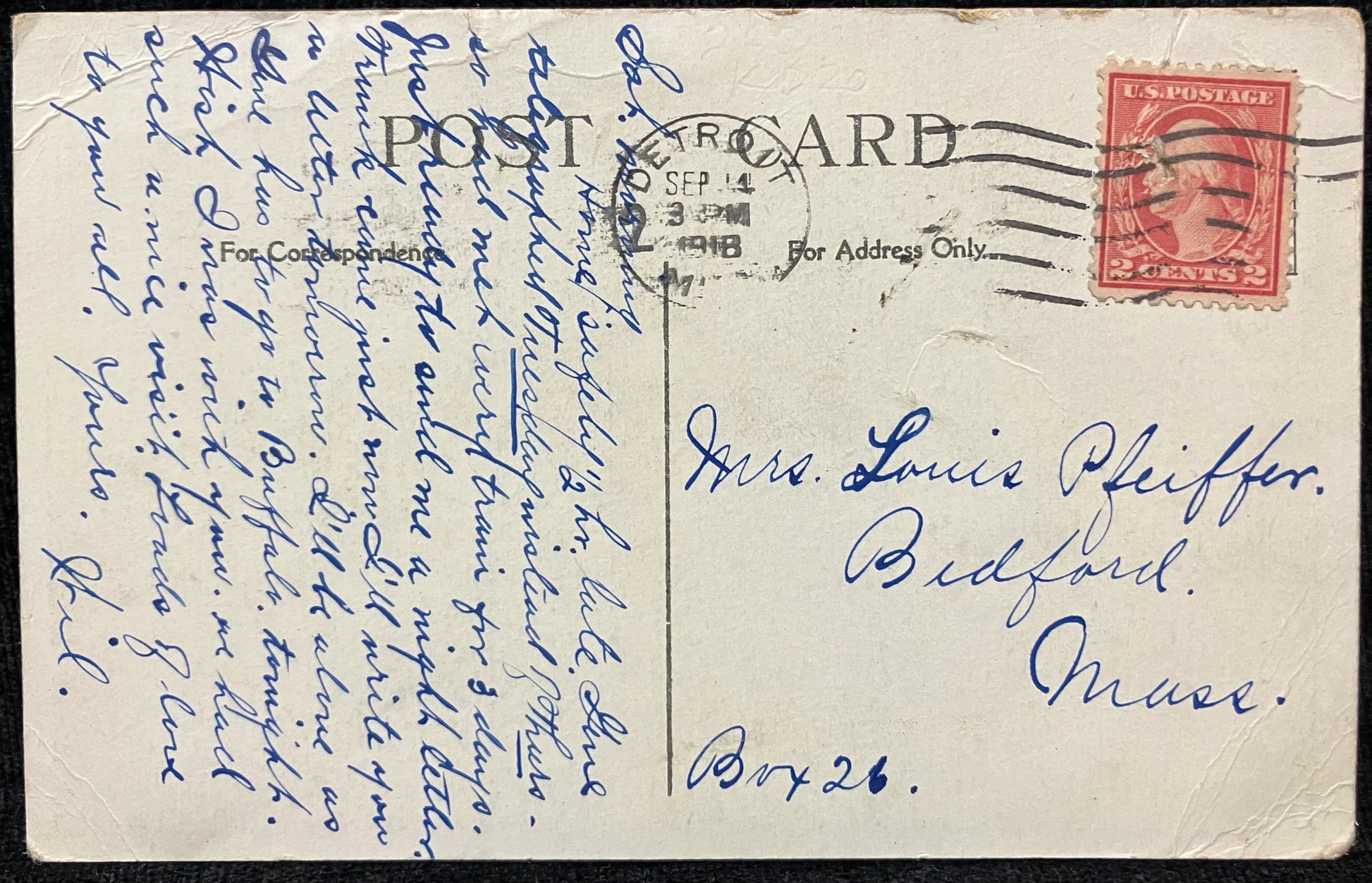 Mailed on August 14, 1918, from Detroit, Michigan. Red two-cent George Washington stamp