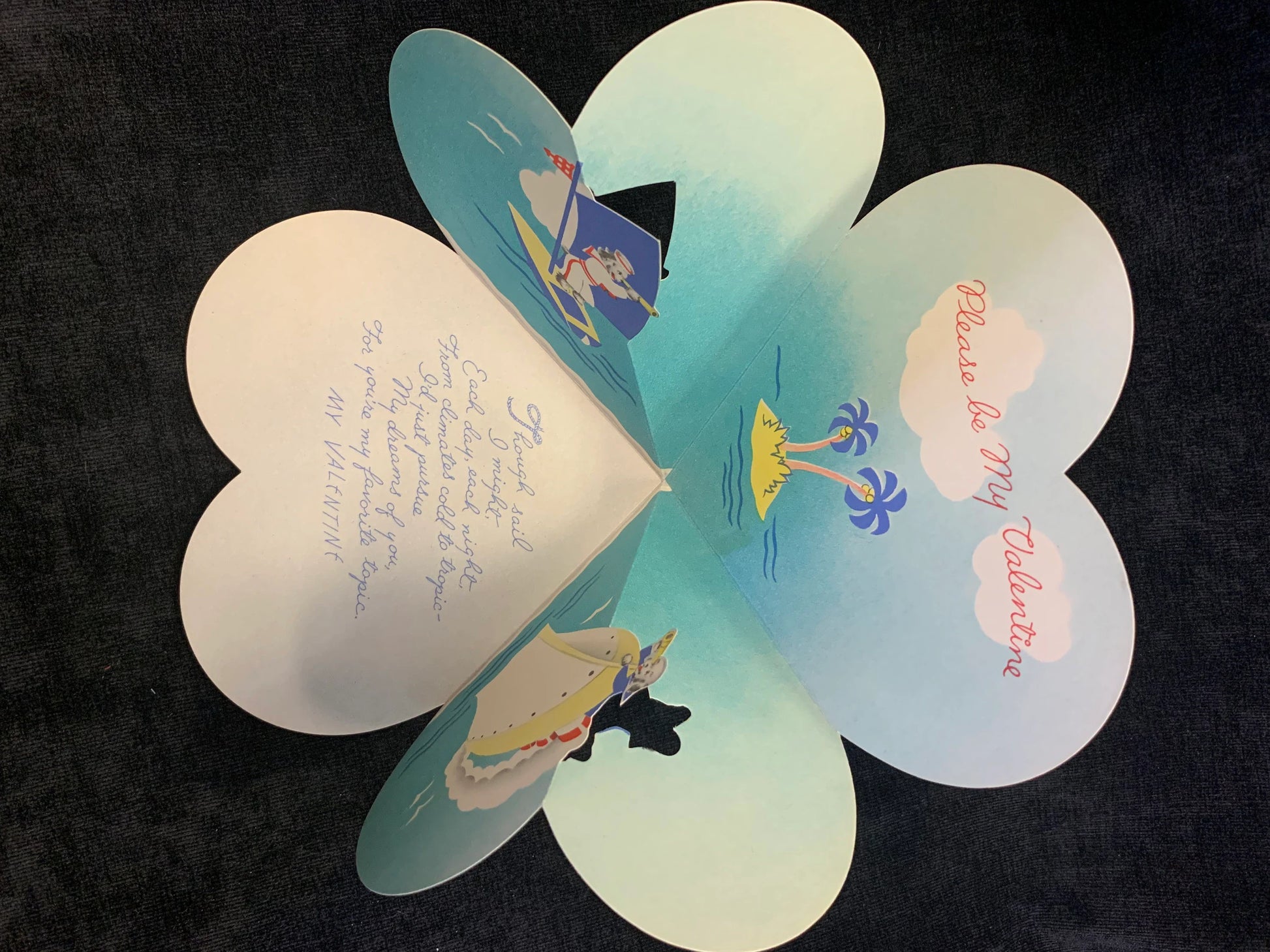 Die Cut Six Fold Golden Bell Valentine from 1940's to early 1950's. Very cute and unusual fold out Valentine from Golden Bell Company. An adventurous puppy dog searches from ship and small boat for love looking at an island. Good condition, never used. I have never come across another fold out that has six folds and is die cut. Printed patent pending on back and numbered, never signed and no marks. The front of the card reads "To my Valentine". Inside the card reads "Please be my Valentine. Though said I might, Each day, each night, From climates to tropic - I'd just pursue My dreams of you, For you're my favorite topic. My Valentine." The measurements shown are when the card in unfolded.