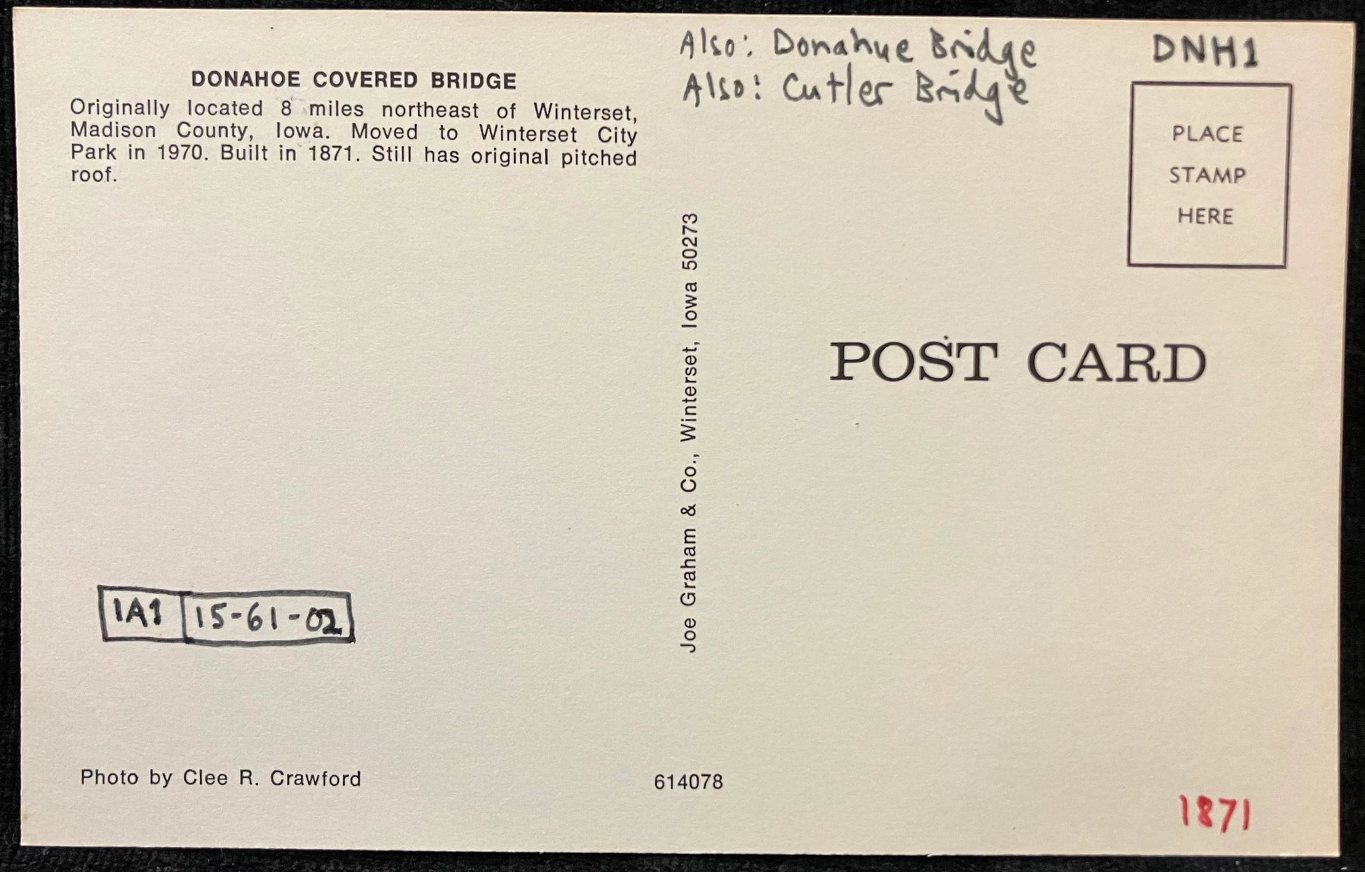 On back: DONAHOE COVERED BRIDGE | Originally located 8 miles northeast of Winterset, Madison County, Iowa. Moved to Winterset City Park in 1970. Built in 1871. Still has original pitched roof.