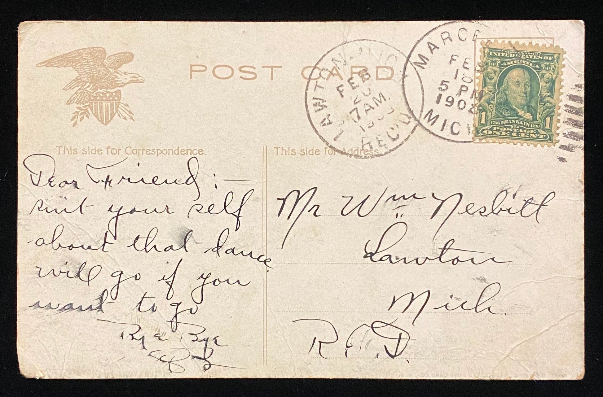 Mailed. Postmark Feb 20, 1908. Green, one cent Ben Franklin stamp