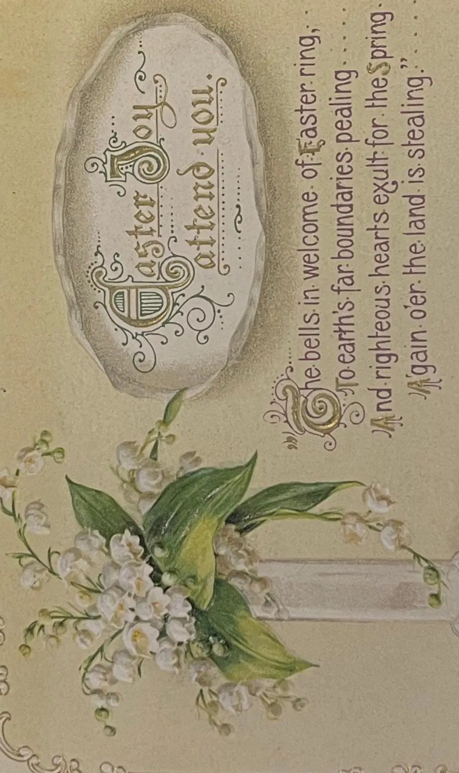 Front Info: The bells in welcome of Easter ring,.. To earths far boundaries pealing.....And righteous hearts exult for the Spring. Again o'er the land is stealing."....