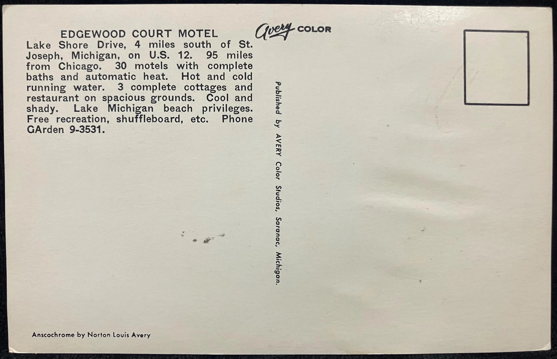 Back: EDGEWOOD COURT MOTEL Lake Shore Drive, 4 miles south of St. Joseph, Michigan, on U.S. 12. 95 miles from Chicago. 30 motels with complete baths and automatic heat. Hot and cold running water. 3 complete cottages and restaurant on spacious grounds. Col and shady. Lake Michigan beach privileges. Free recreation, shuffleboard, etc. Phone Garden 9-3531