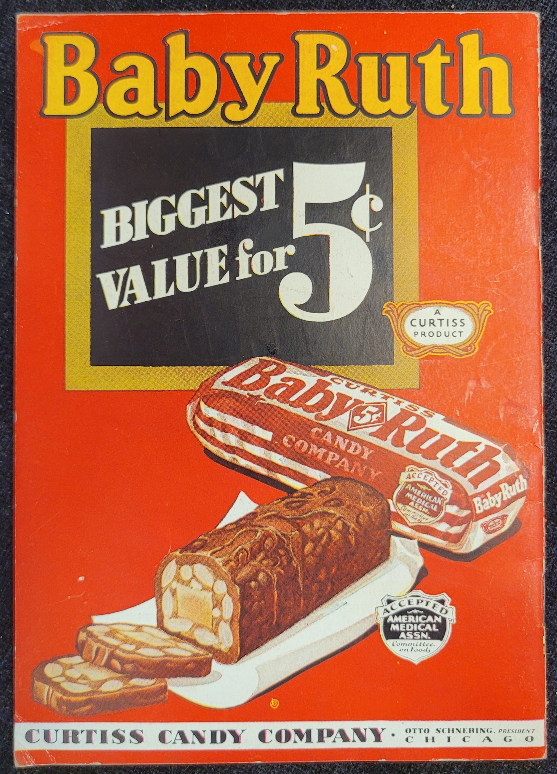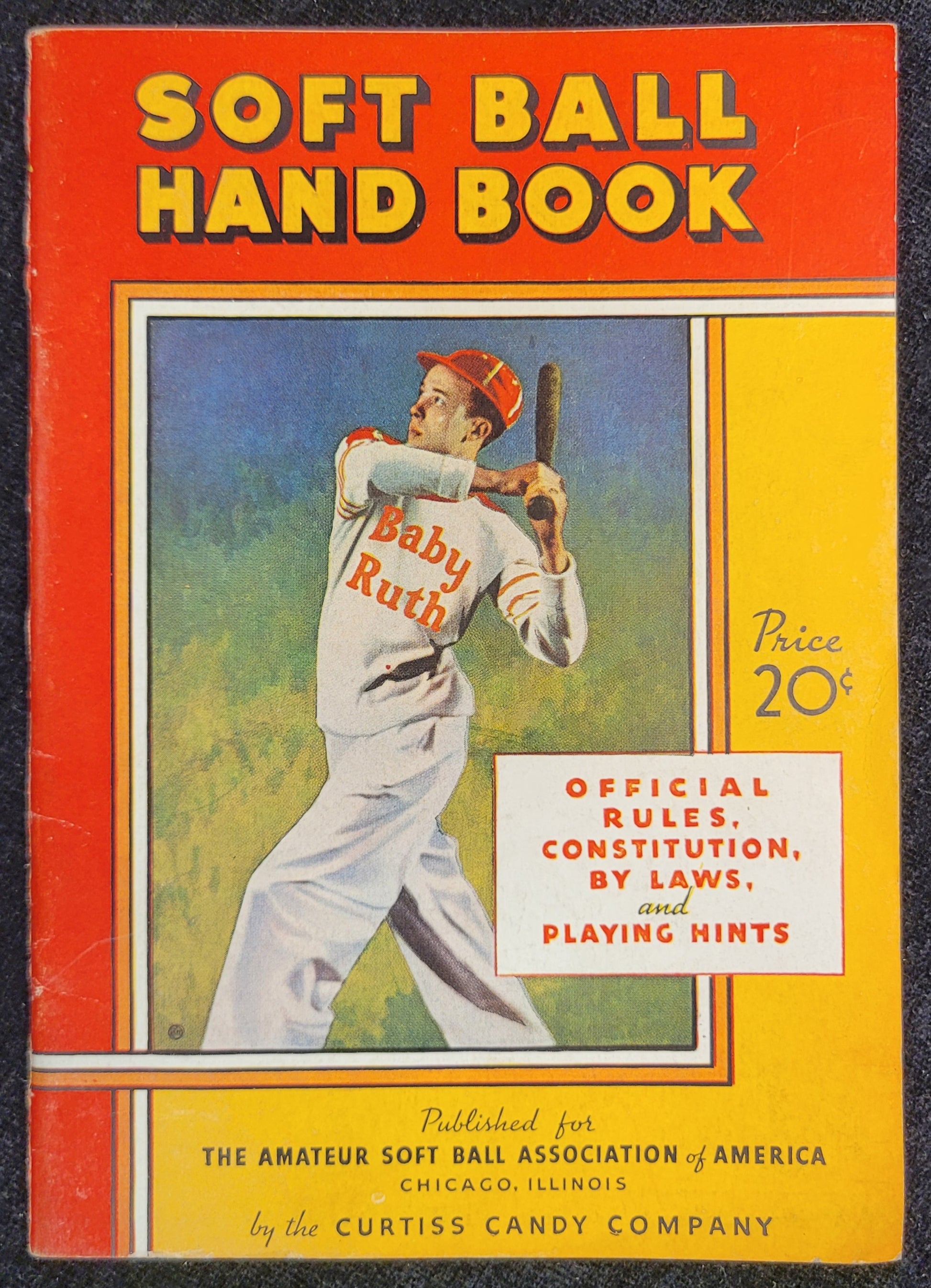 This softball rule book was published by the Curtiss Candy Company in 1934. The Curtiss Candy Co was a confectionery brand founded in 1916 by Otto Schnering. Their first product was originally called "Kandy Kake," which would later be rebranded to the iconic "Baby Ruth" in 1920. The book itself is in excellent condition with vibrant colors and minimal signs of aging or discoloration.