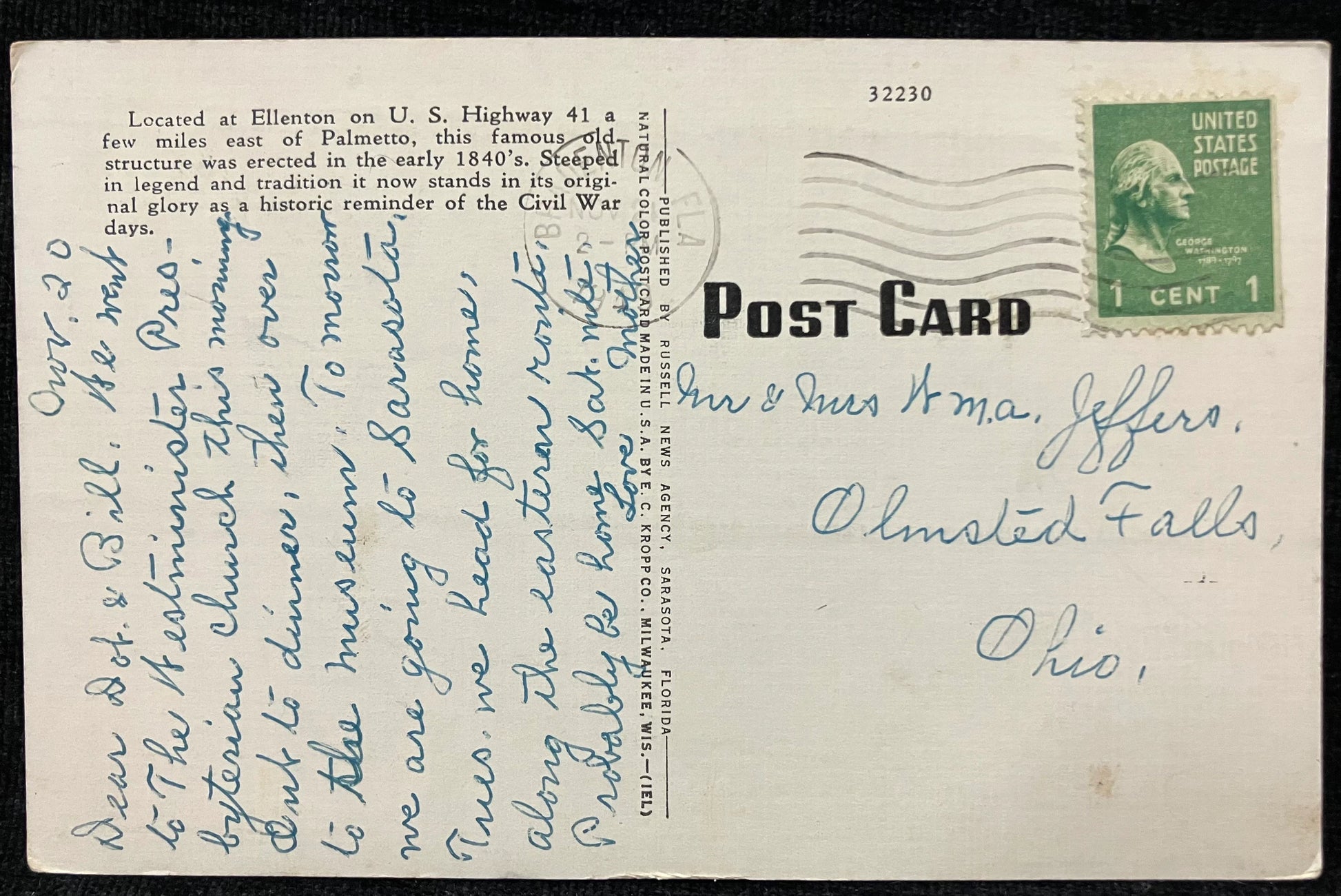 Back: Located at Ellenton on U. S. Highway 41 a few miles east of Palmetto, this famous old structure was erected in the early 1840’s. Steeped in legend and tradition it now stands in its original glory as a historic reminder of the Civil War days.