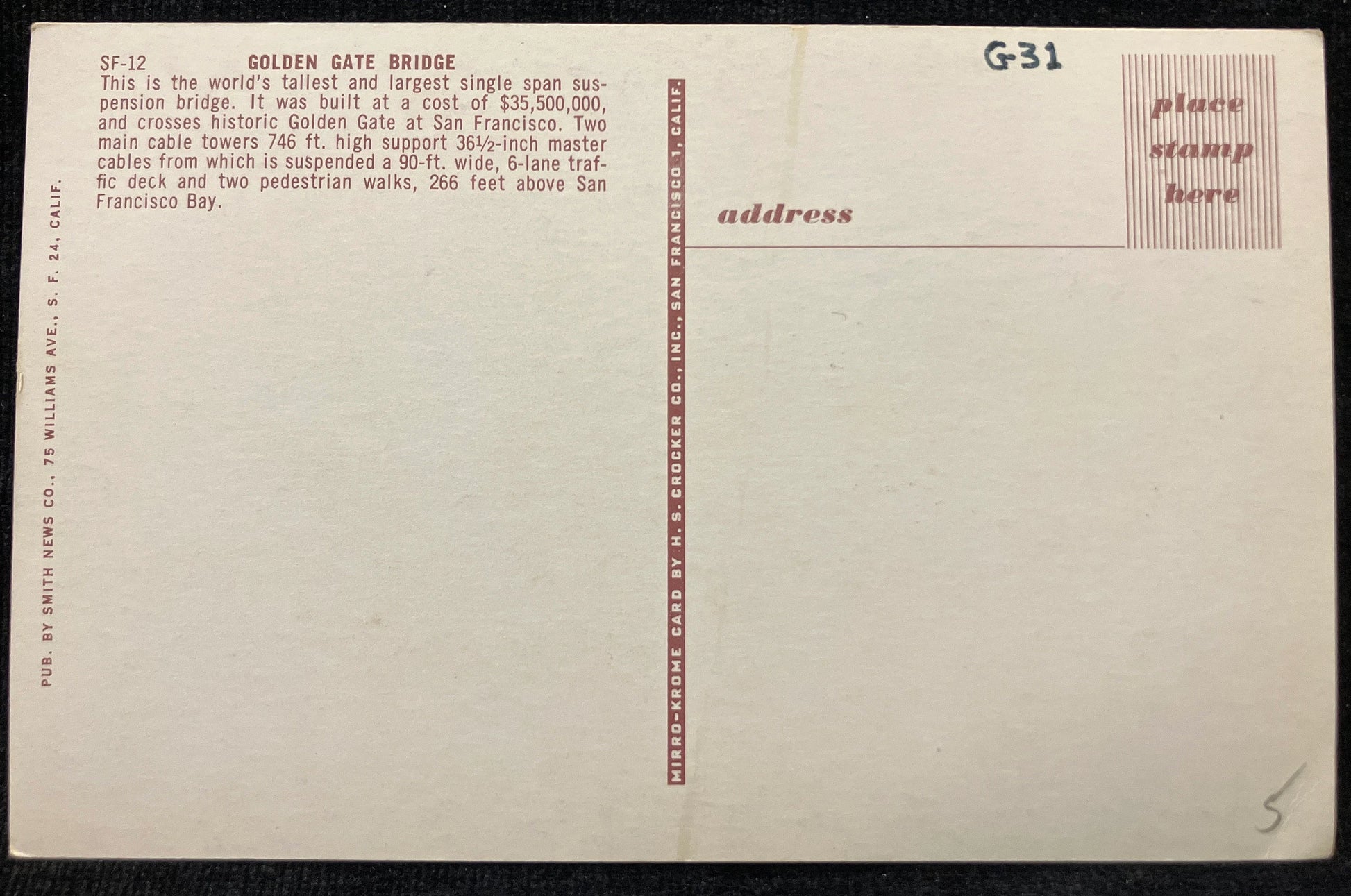 Back: GOLDEN GATE BRIDGE This is the world’s tallest and largest single span suspension bridge. IT was built at a cost of $35,500,000 and crosses the historic Golden Gate of San Francisco. Two main cable towers 747 ft. tall support 36 1/2 inch master cables from which is suspended a 90 ft. wide 6 lane traffic deck and two pedestrian walks, 266 feet above San Francisco Bay.