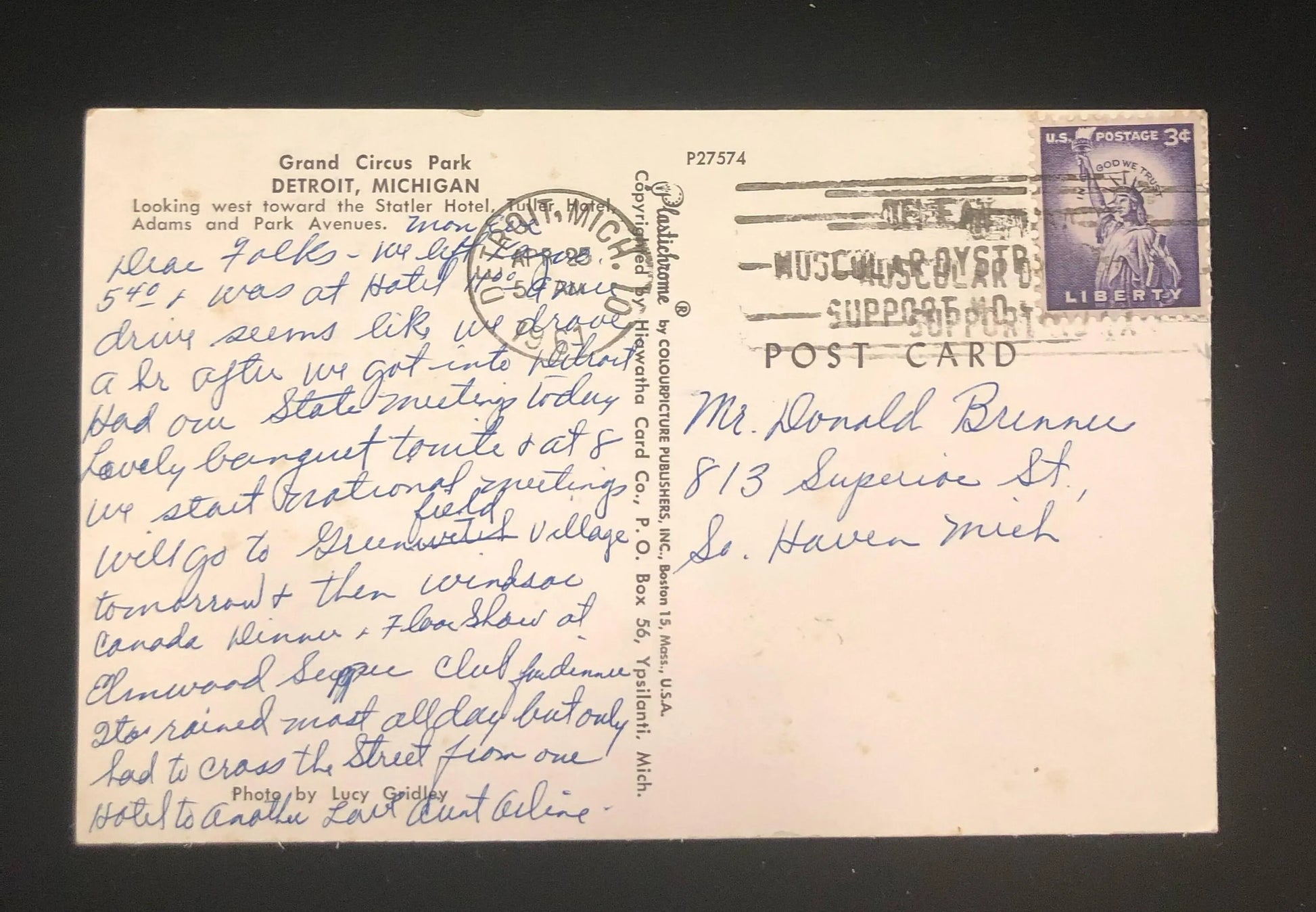 Back copy: Grand Circus Park Detroit, Michigan. Looking West toward the Statler Hotel, Tuller Hotel, Adams and Park Avenues.