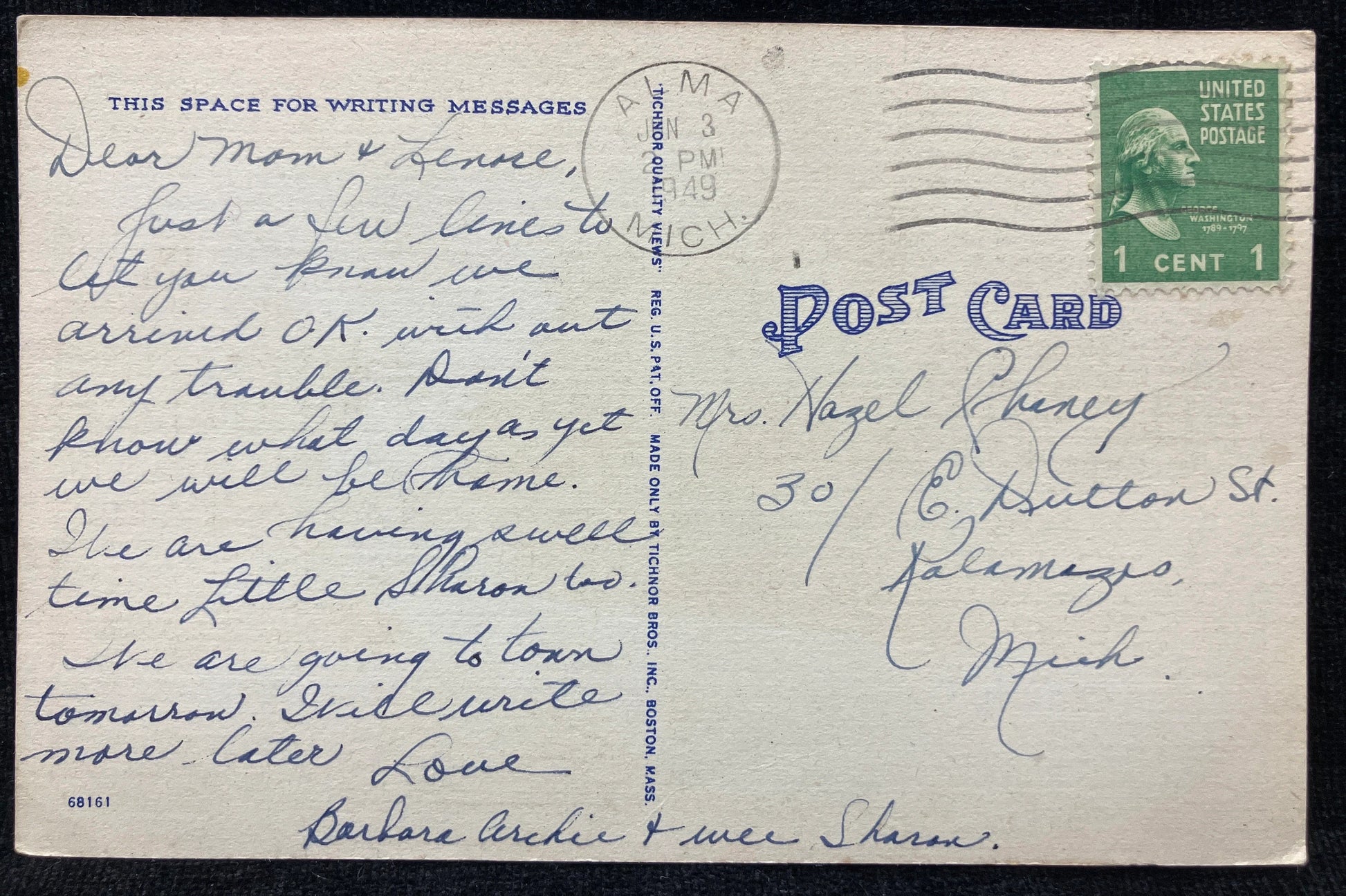 Mailed: Postmark 1949 Detroit, MICH. green one cent George Washington stamp