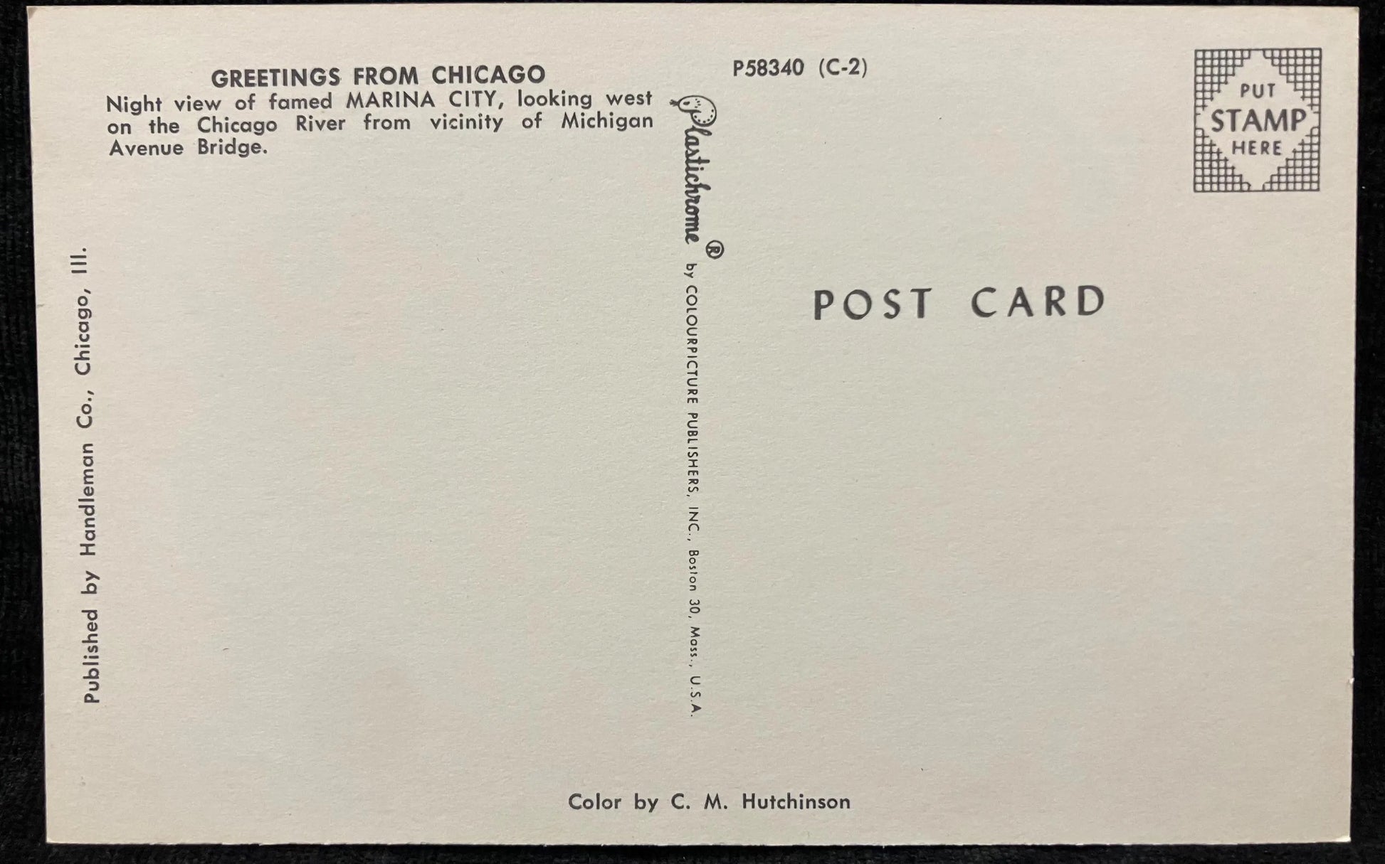 Back: GREETINGS FROM CHICAGO Night view of famed MARINA CITY, looking west on the Chicago River from vicinity of Michigan Avenue Bridge.