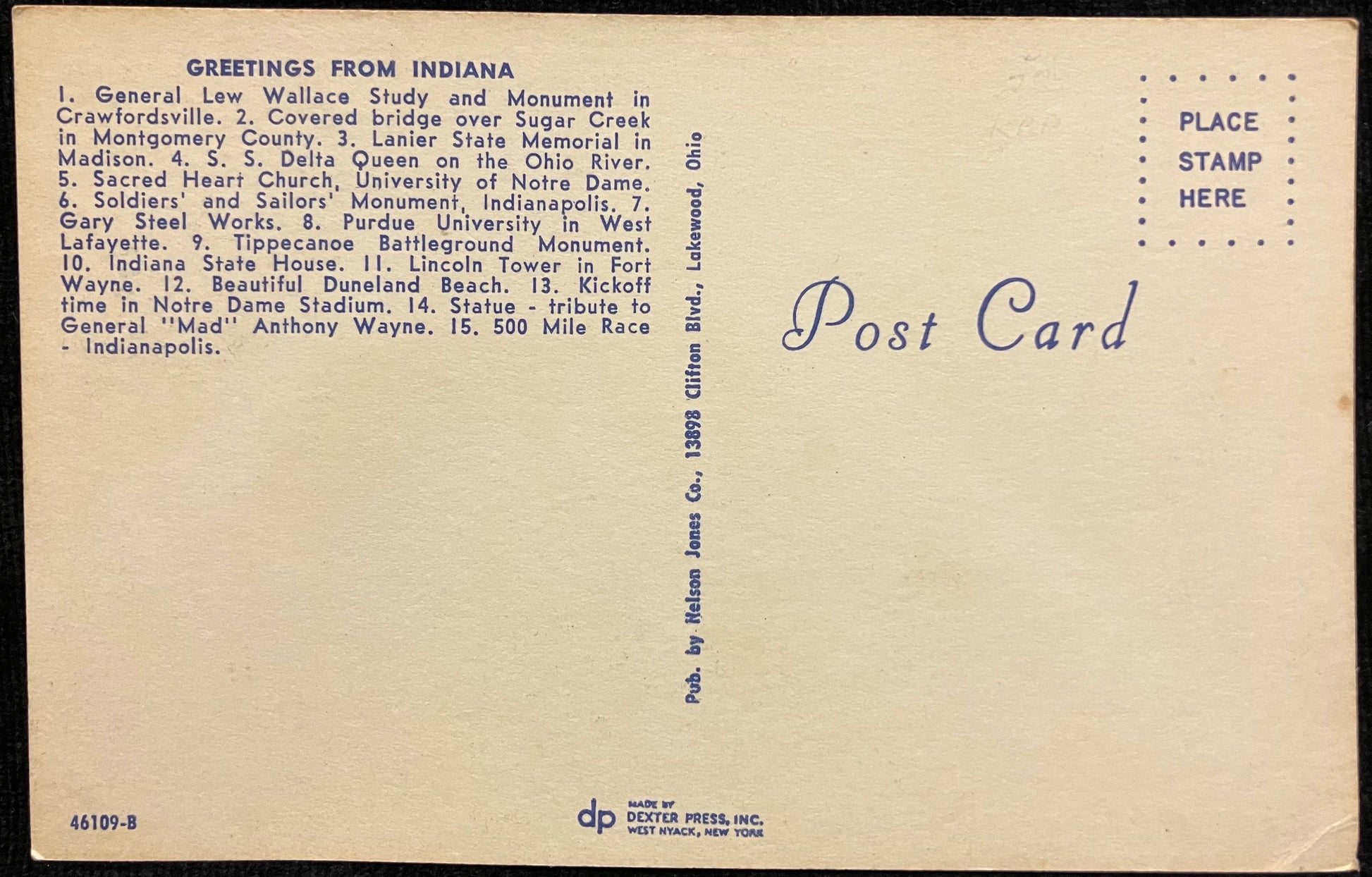 On back: GREETINGS FROM INDIANA 1. General Lew Wallace Study and Monument in Crawfordsville. 2. Covered bridge over Sugar Creek in Montgomery County. 3 Lanier State Memorial in Madison. 4. S. S. Delta Queen on the Ohio River. 5. Sacred Heart Church, University of Notre Dame. 6. Soldiers' and Sailors' Monument, Indianapolis. 7. Gary Steel Works. 8. Purdue University in West Lafayette. 9. Tippecanoe Battleground Monument. 10. Indiana State House. 11. Lincoln Tower in Fort Wayne. 12. Beautiful Duneland Beach. 13. Kickoff time in Notre Dame Stadium. 14 Statue - tribute to General "Mad" Anthony Wayne. 15. 500 Mile Race - Indianapolis
