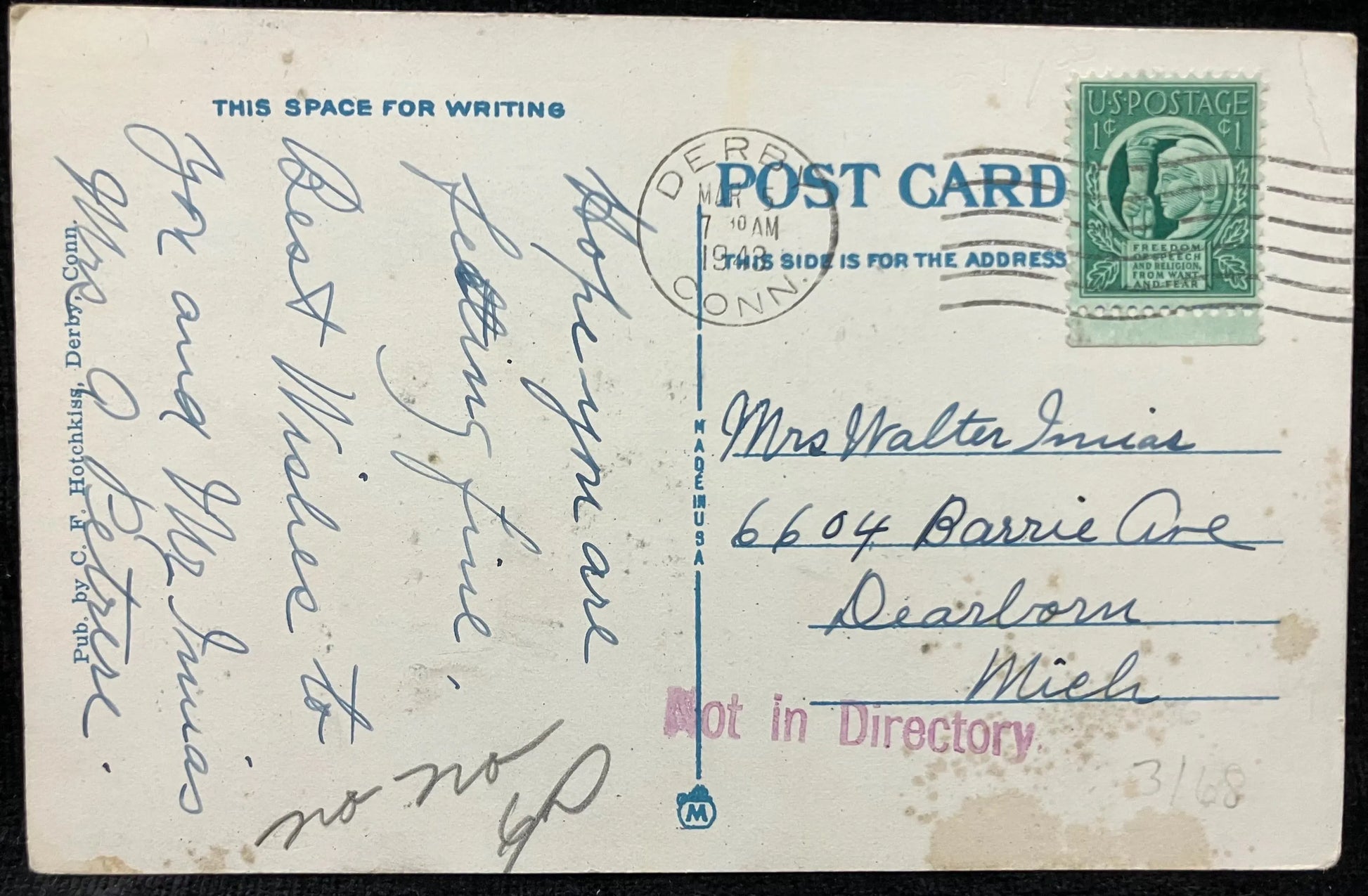 Mailed: Postmark March 5, 1943. Green one cent Lady Liberty Freedom of Speech and Religion from Want and Fear stamp