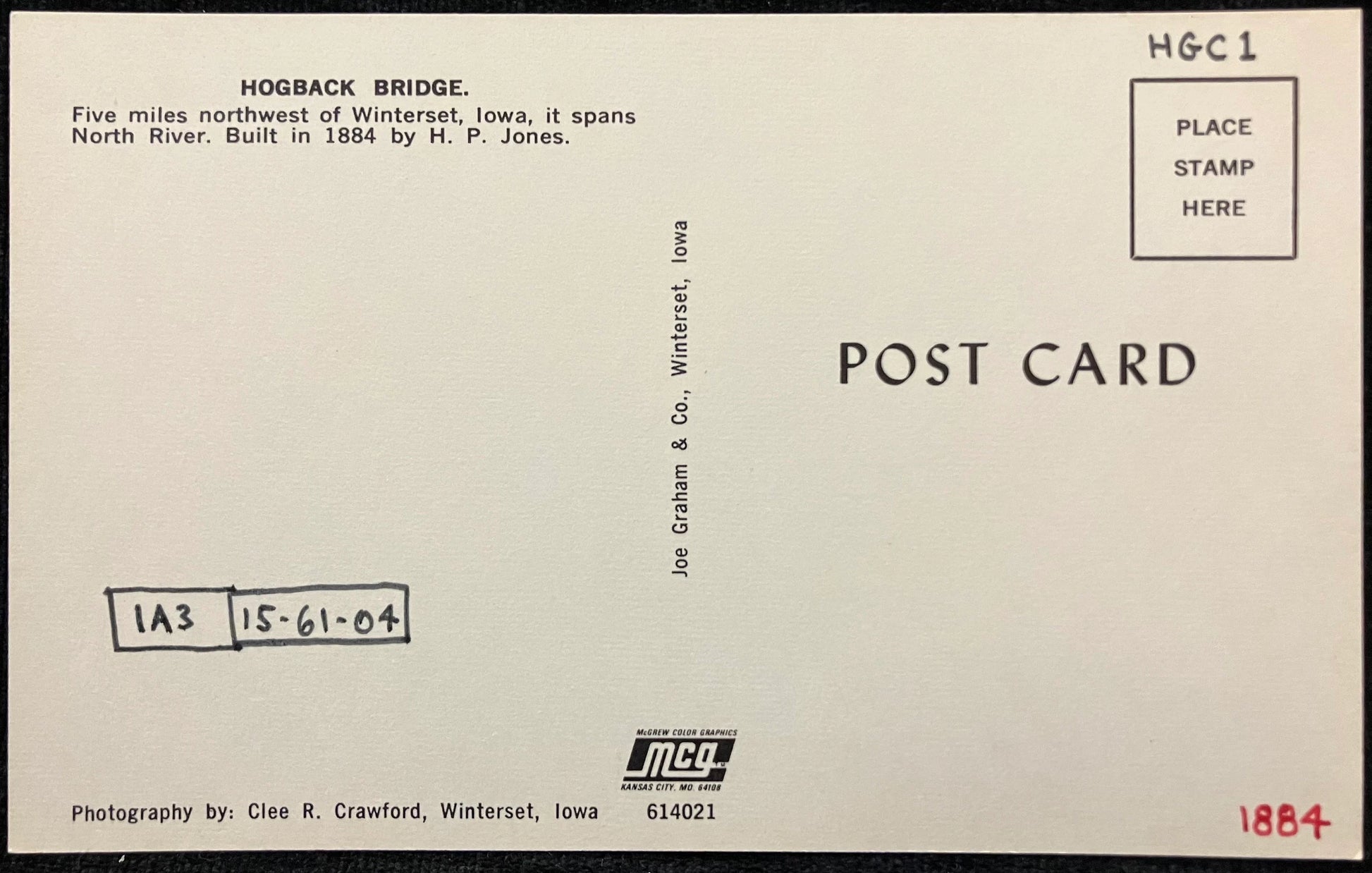 On back: HOGBACK BRIDGE | Five miles northwest of Winterset, Iowa, it spans North River. Built in 1884 by H. P. Jones.