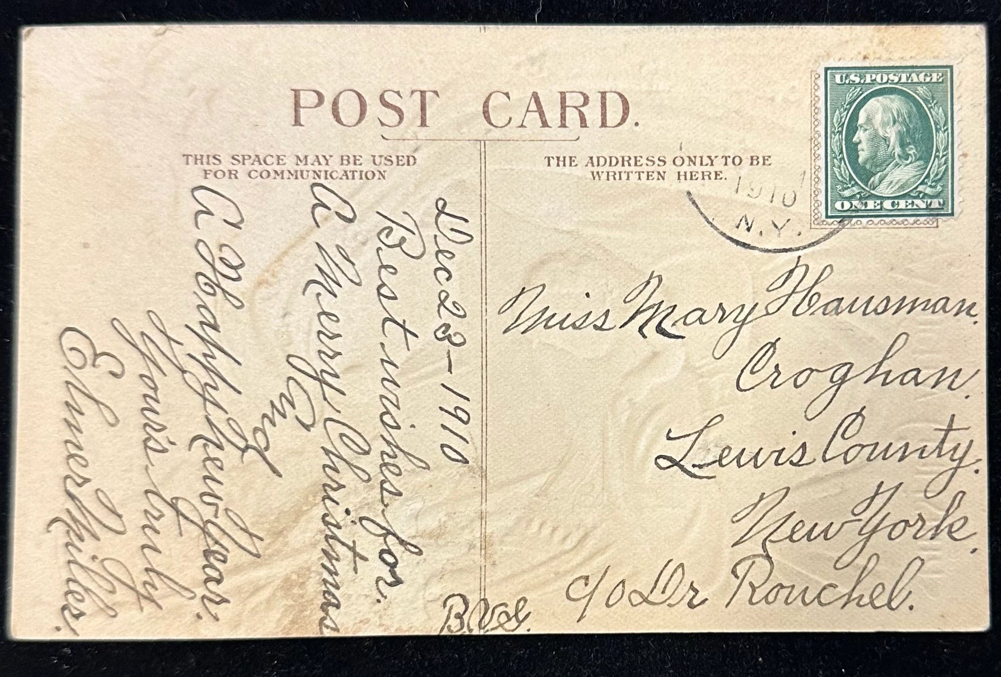 Mailed: Posted on 1910 from New York with a green 1 cent Ben Franklin stamp