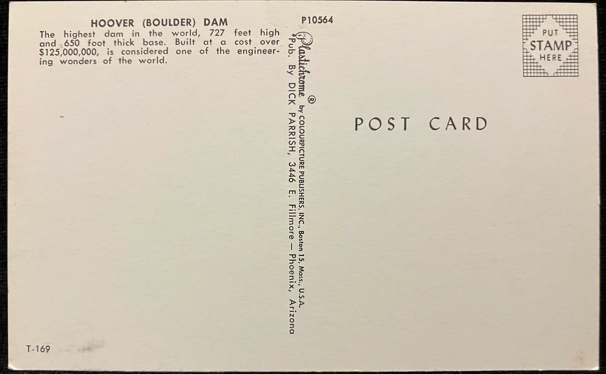 On back: Hoover (Bouler) Dam. The highest dam in the world, 727 feet high and 650 foot thick base. Built at a cost over $125,000,000, is considered one of the engineering wonders of the world.