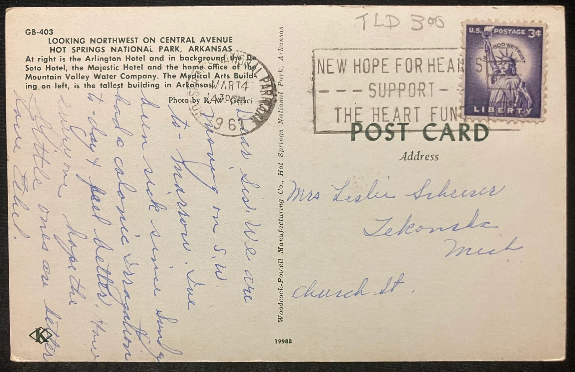 Mailed: Postmark March 14, 1961, Hot Springs National Park, Arkansas, purple In God We Trust purple Liberty Stamp.