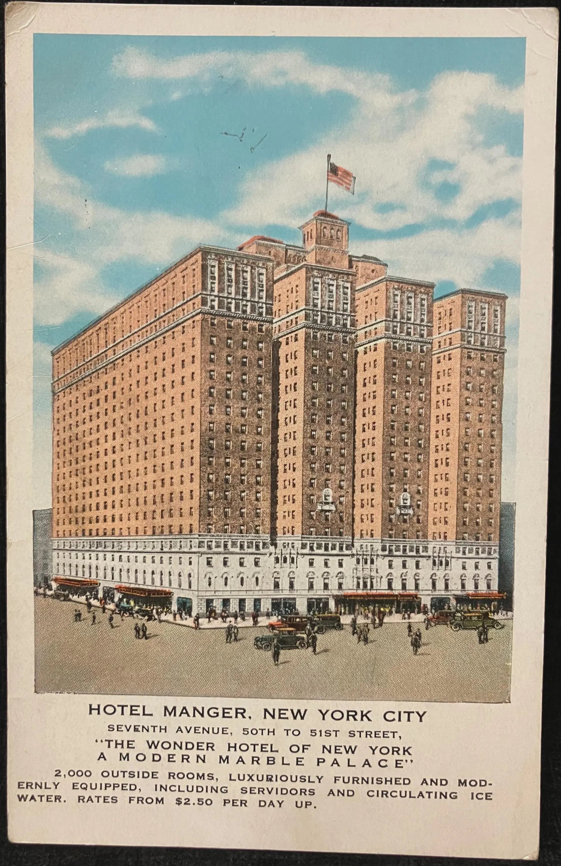 Front: Hotel Manger, New York City Seventh Avenue, 50th to 51st Street, “The Wonder Hotel of New York A Modern Marble Palace” 2,000 Outsider Rooms, Luxuriously Funrished and Modernly Equipped, including servidors and circulating ice water. Rates from $2.50 per day up.