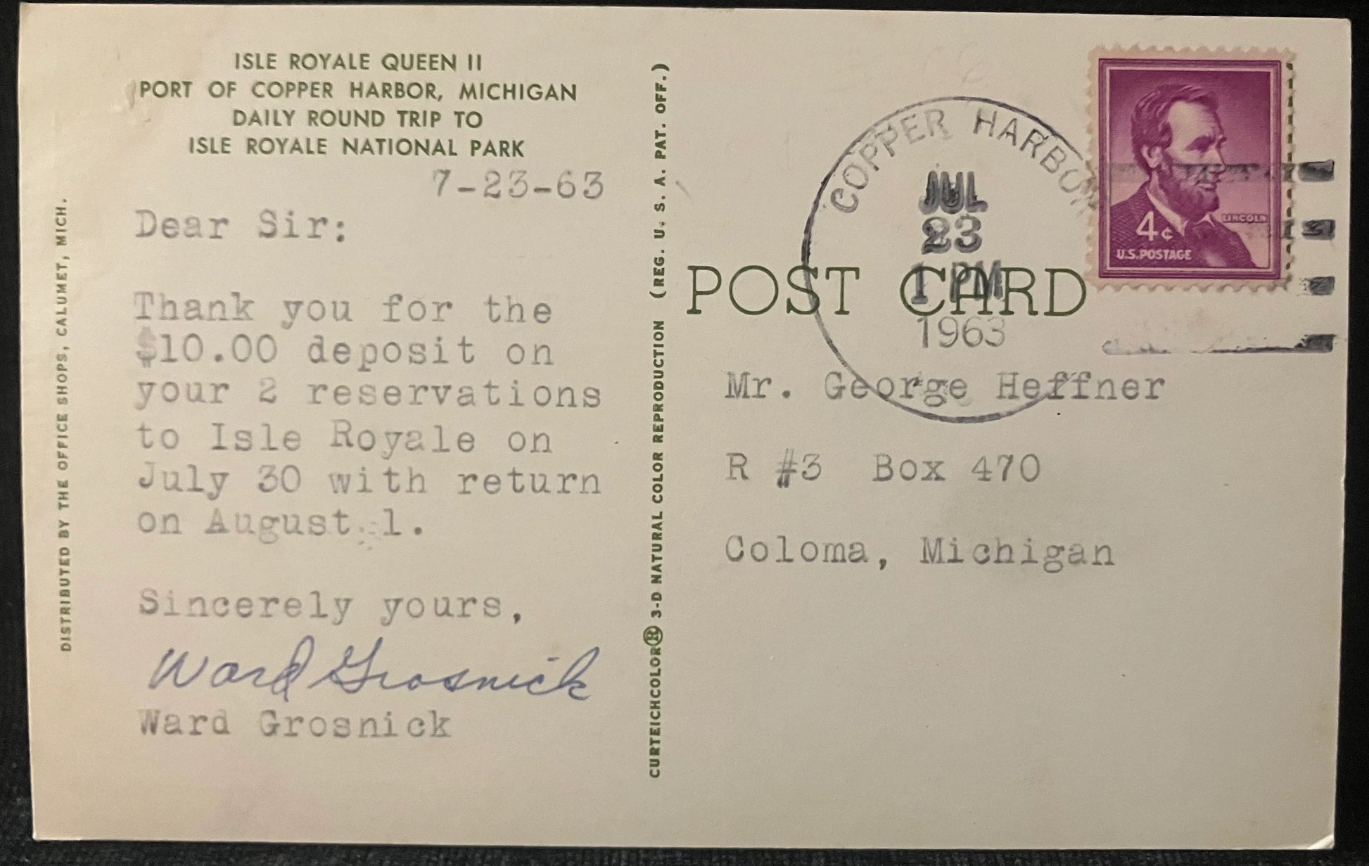 On back: Isle Royale Queen II Port of Copper Harbor, Michigan Daily Round Trip to Isle Royale National Park
