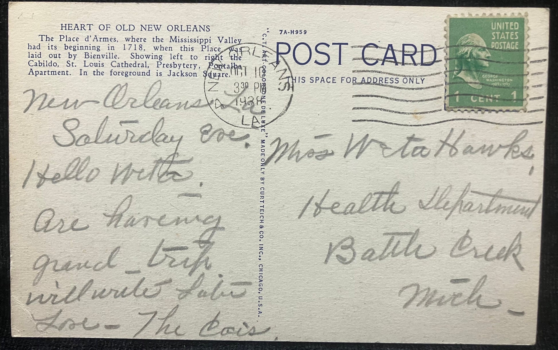 Back: HEART OF OLD NEW ORLEANS. The Place d’Armes, where the Mississippi Valley had its beginning in 1718 when this Place was laid out by Bienville. Showing left to right the cabildo, St. Louis Cathedral, State Historical Musuem, Pontalba Apartments. In the foreground is Jackson Square. The St. Louis Cathedral was erected in 1718 by Don Almonaster y Roxas, rebuilt in 1720; present building 1794. The tombs of the Marigneys lie beneath the floor in front of the altar.