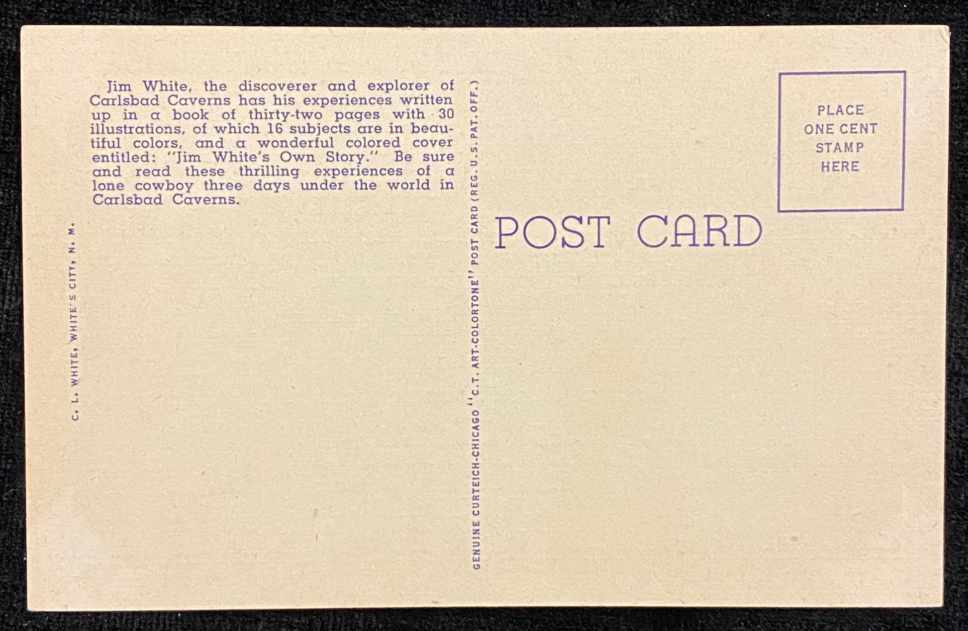 Back: "Jim White, the discoverer and explorer of Carlsbad Caverns has his experiences written up in a book of thirty-two pages with 30 illustrations, of which 16 subjects are in beautiful colors, and a wonderful colored cover entitled: 'Jim White's Own Story.' Be sure and read these thrilling experiences of a lone cowboy three days under the world in Carlsbad Caverns."