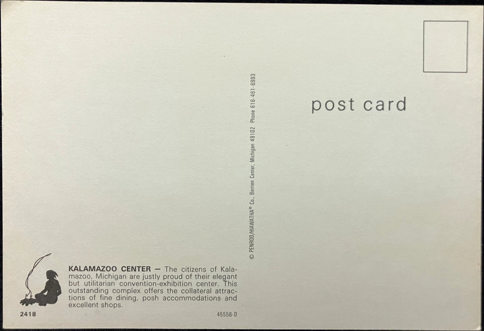 On back: Kalamazoo Center - The citizens of Kalamazoo, Michigan are justify proud of their elegant but utilitariant convention-exhibition center. This outstanding complex offers the collateral attractions of fine dining, posh accomodations and excellent shops.