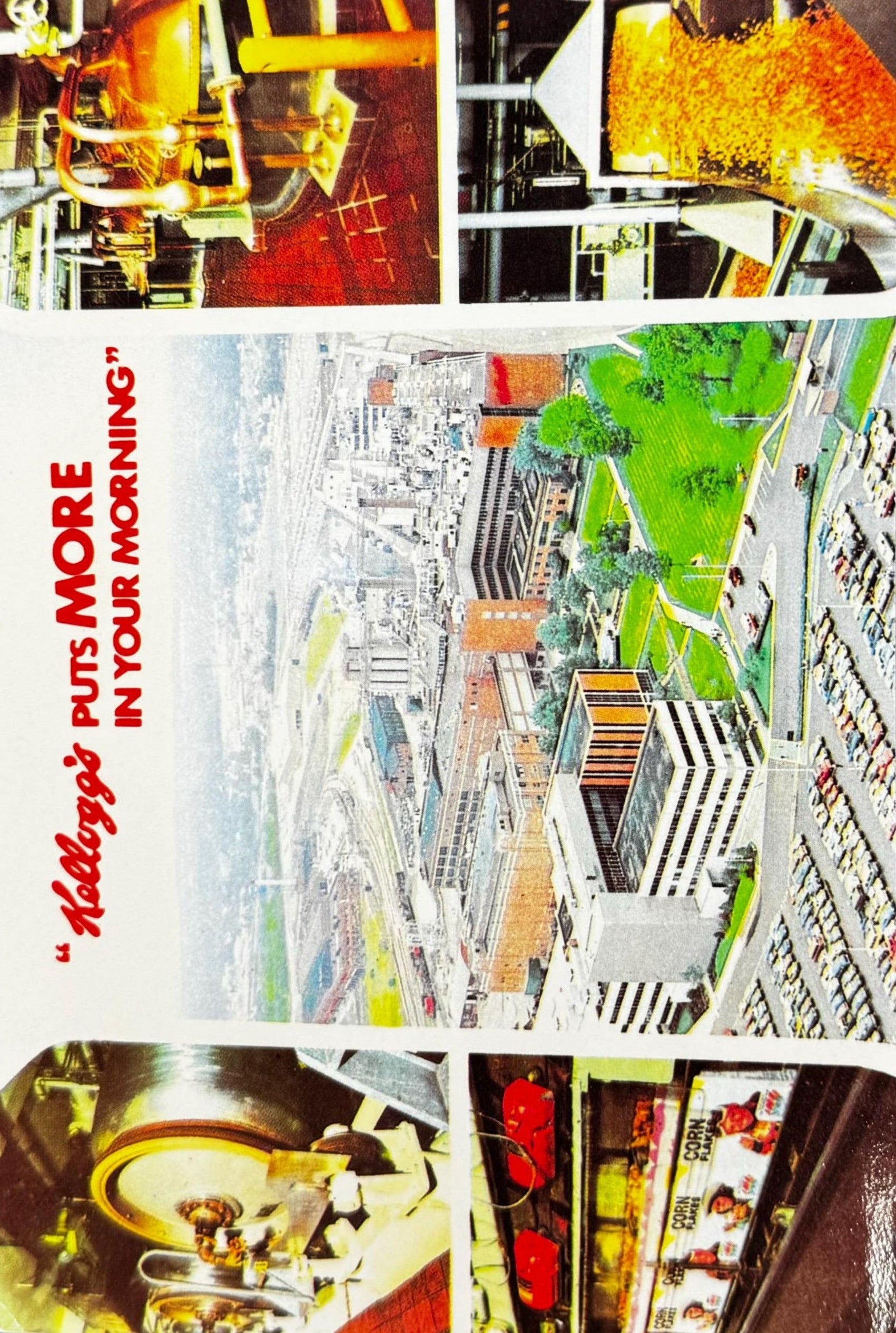 This vintage postcard is in good condition, some wear on one of the corners. The front reads 'Kellogg's Puts More In Your Morning' and the photography collage is of the Kellogg factory.