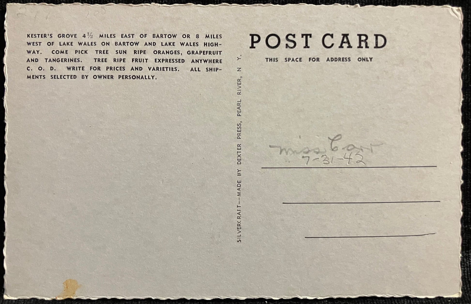 Back: Kester’s Grove 4 1/2 Miles East of Bartow or 8 miles West of Lake Wales on Bartow and Lake Wales Highway. Come pick tree sun ripe oranges, grapefruit, and tangerines. Tree ripe fruit expressed anywhere C. O. D. write for prices and varieties. All shipments selected by owner personally.