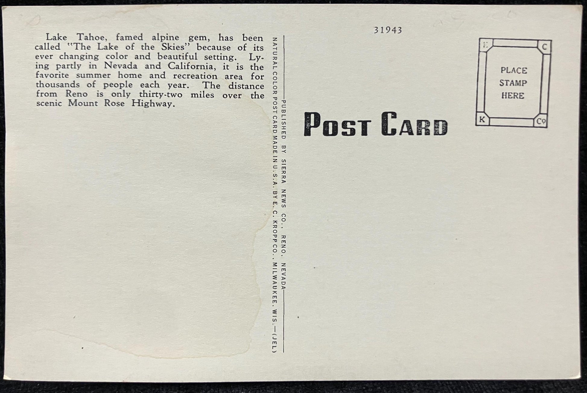 Back: Lake Tahoe, famed alpine gem, has been called "The Lake of the Skies' because of its ever changing color and beautiful setting. Lying partly in Envada and California, it is the favorite summer home and recreation area for thousands of people each year. The mistaken from Reno is only thirty two miles over the scenic Mount Rose Highway.