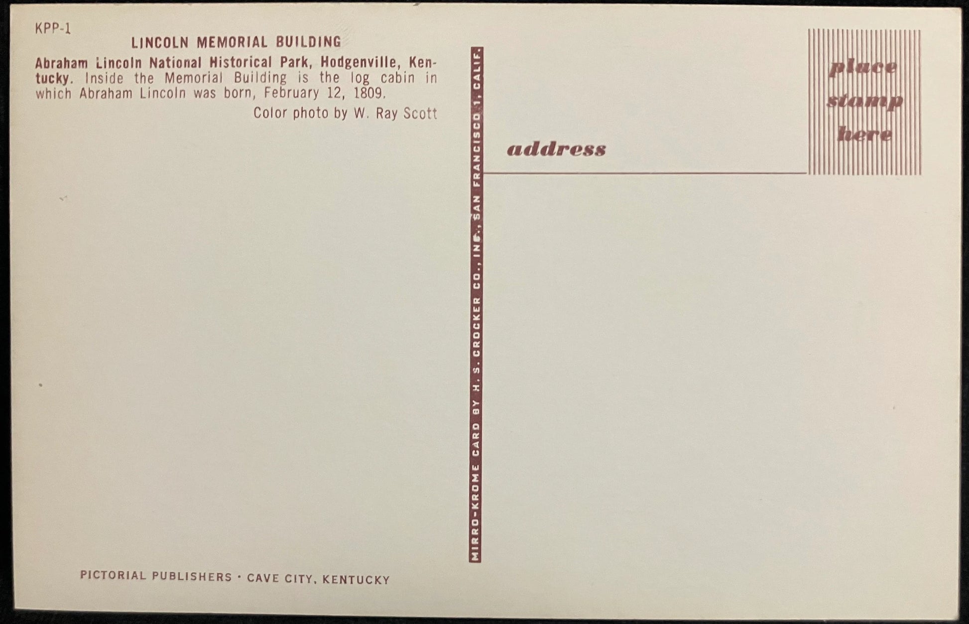 On front: A photo of the Lincoln Memorial Building in Hodgenville, Kentucky