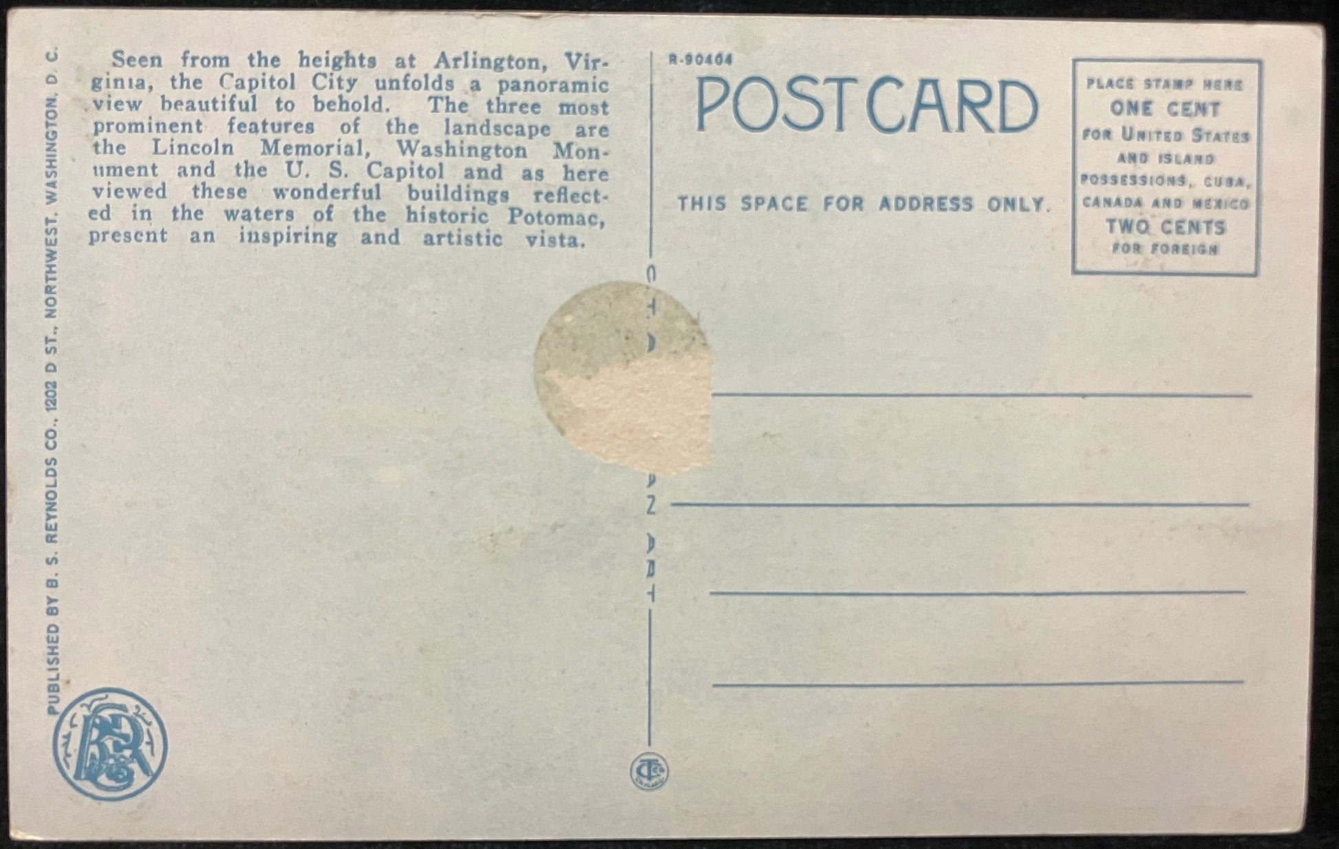 Back: Seen from the heights at Arlington, Virginia, the Capitol City unfolds a panoramic view beautiful to behold. The three most prominent features of the landscape are the Lincoln Memorial, Washington Monument and the U. S. Capitol and as here viewed these wonderful buildings reflect. ed in the waters of the historic Potomac, present an inspiring and artistic vista.