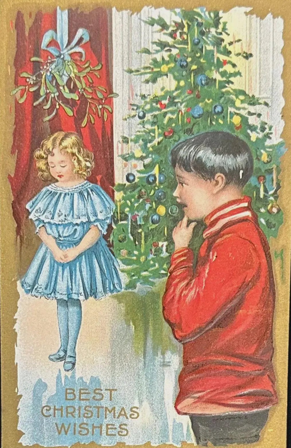 Little Girl Under Mistletoe with Little Boy Looking - Best Christmas Wishes - Vintage 1910 Christmas Postcard