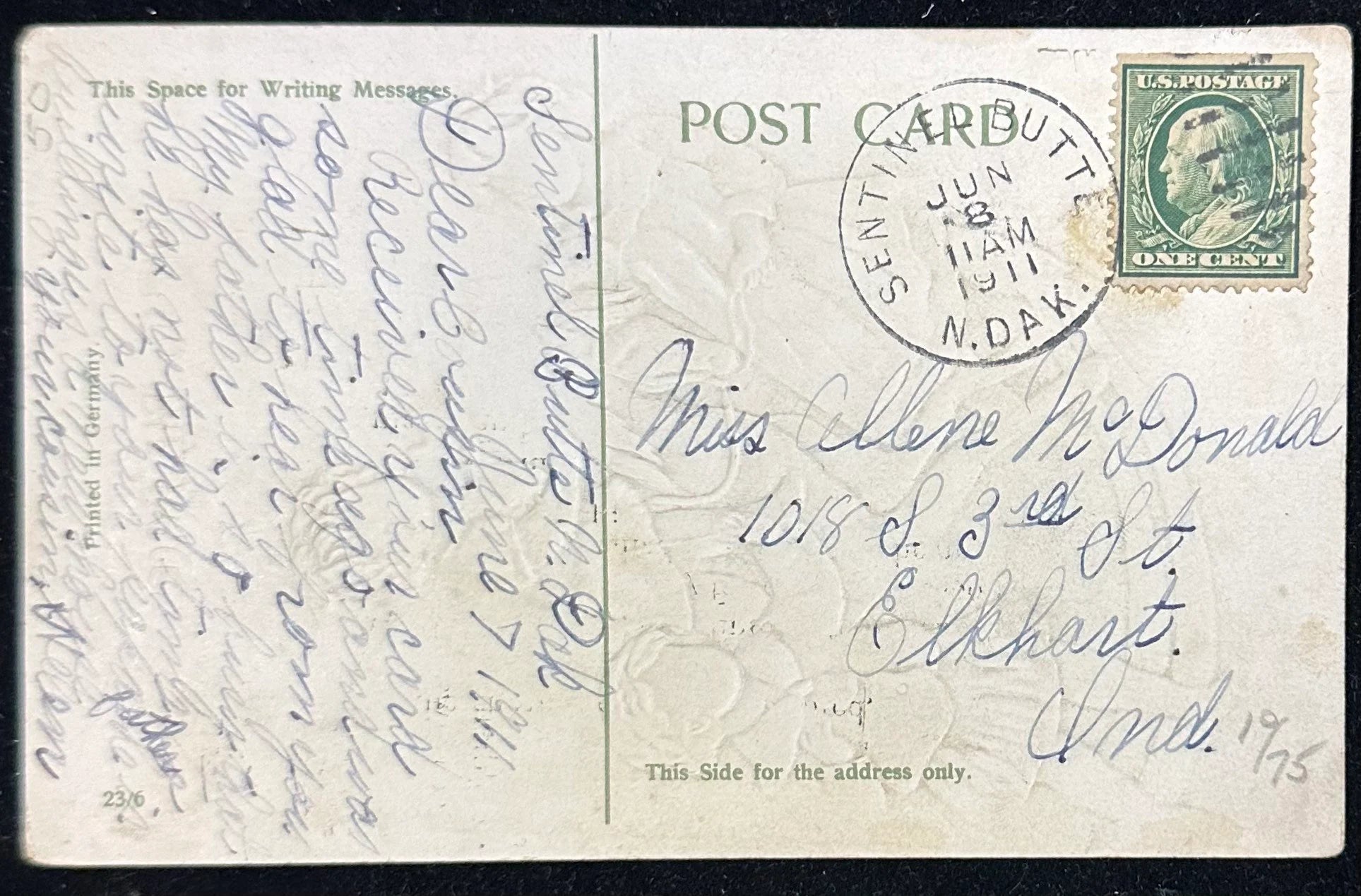 Mailed: Posted on June 8th, 1911 from North Dakota with a green 1 cent Ben Franklin stamp