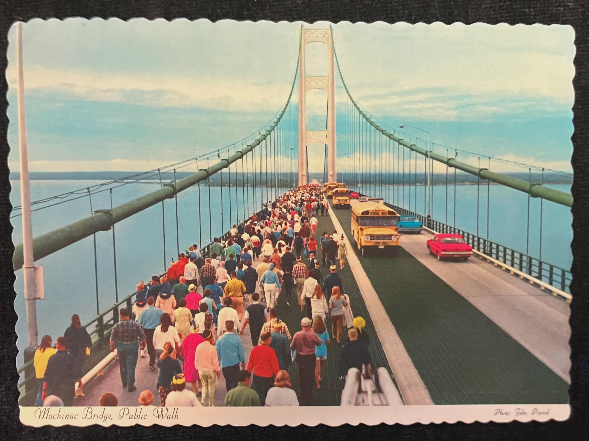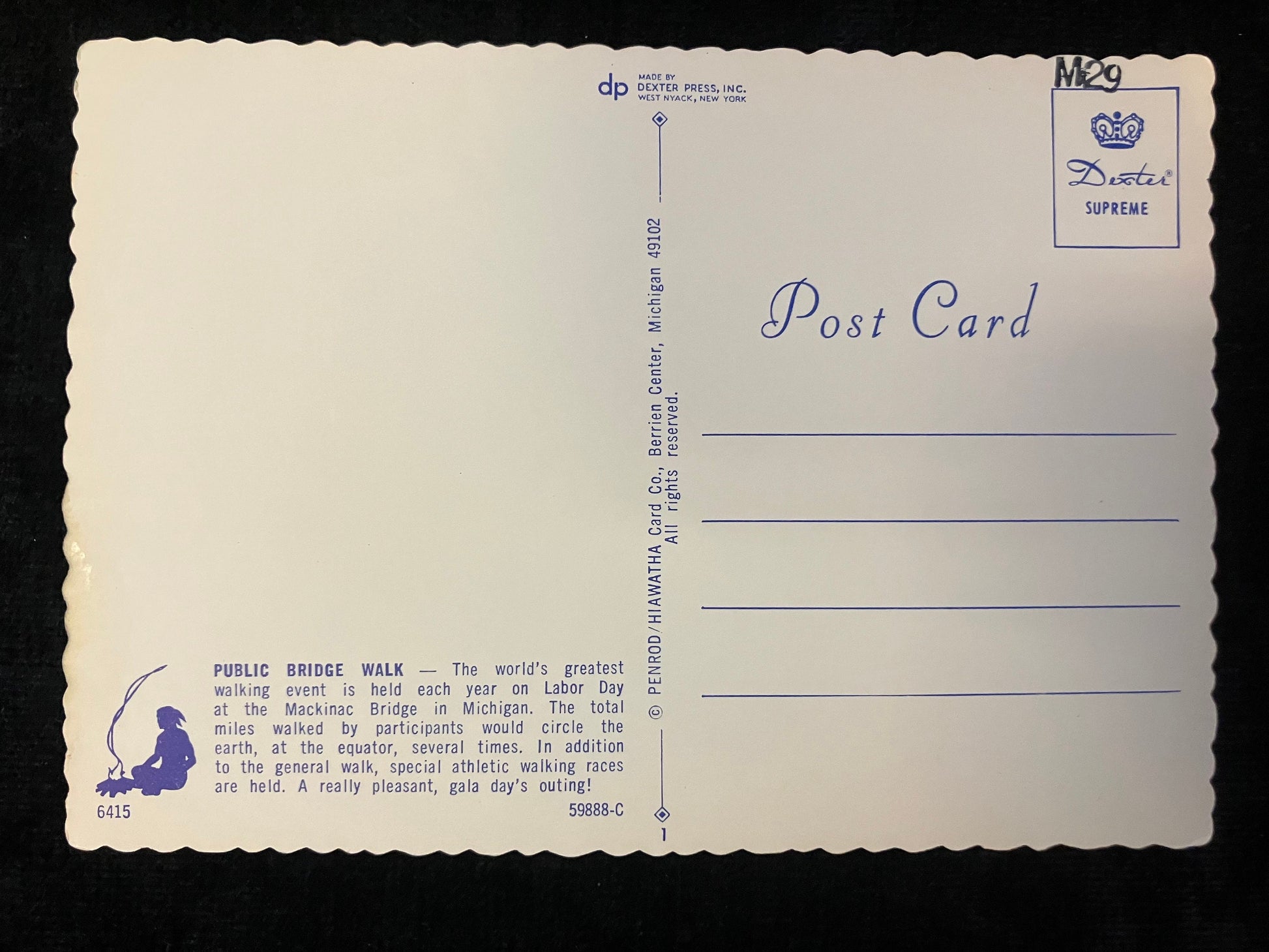 On back of the card: Public Bridge Walk - the world's greatest walking event is held each year on Labor Day at the Mackinac Bridge in Michigan. The total miles walk by participants with circle the earth, at the equator, several times. In addition to the general walk, special, athletic, walking races are held. A really pleasant, Gala days outing!