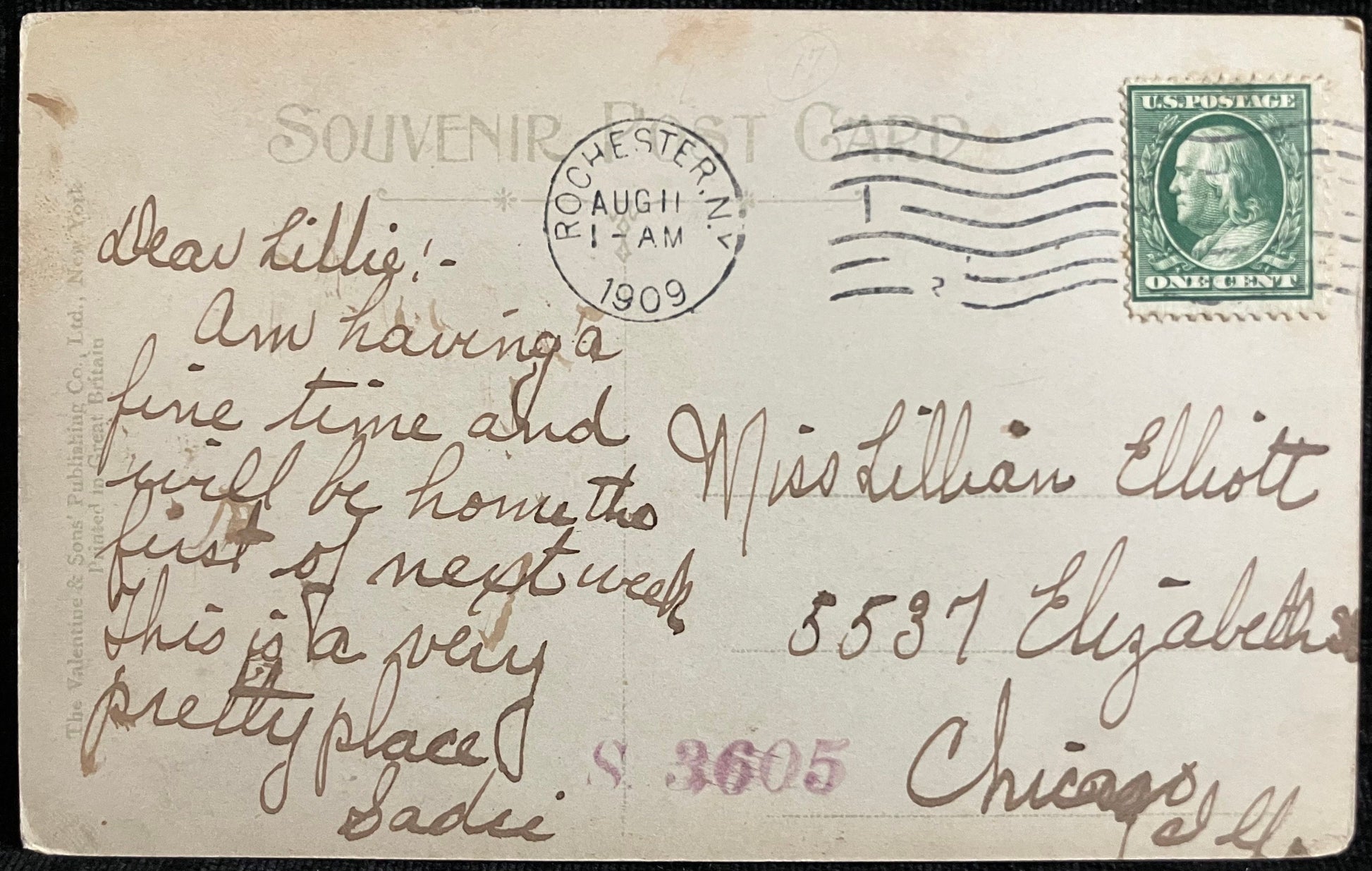 Mailed: Postmark on Aug 11, 1909 from Rochester, N.Y. with a green one cent Benjamin Franklin stamp